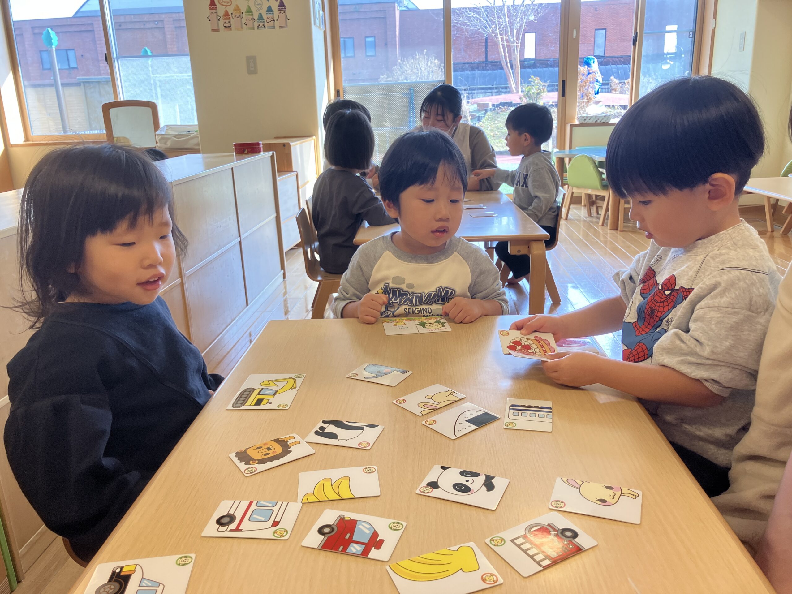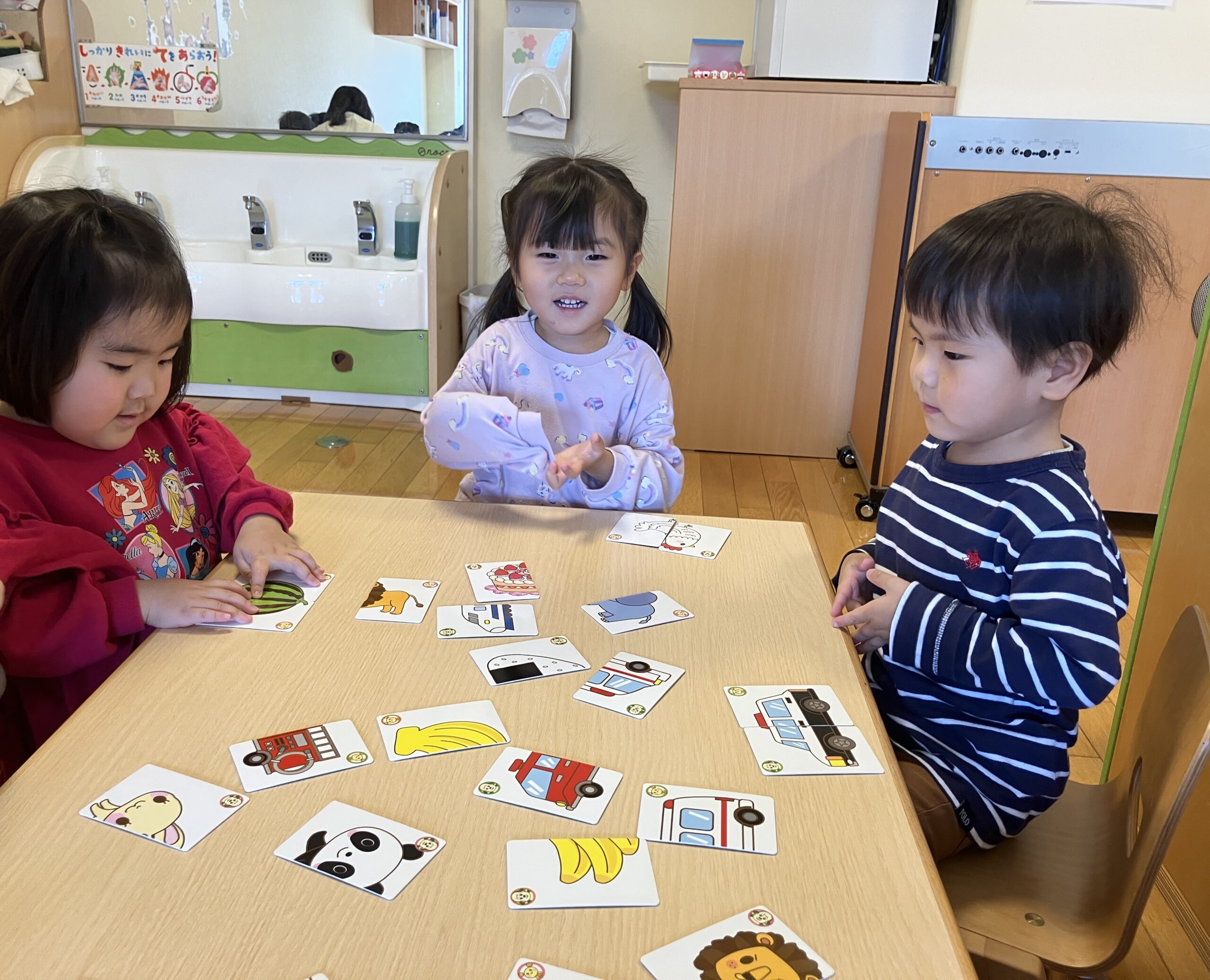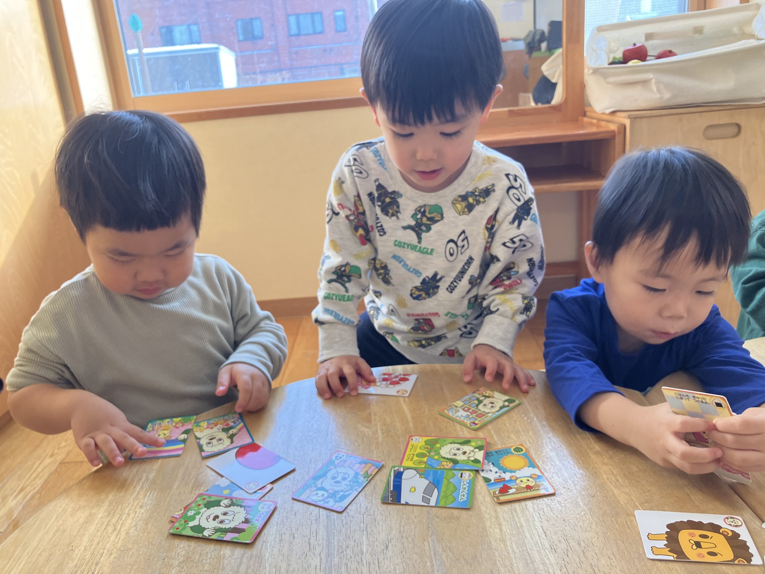 絵合わせカードが今きりん組では大人気!「先生今日もカードする?」「絵合わせカードしたーい!」と朝のおやつの時間からうきうきしています!じゃんけんをして順番にカードひき、カードの場所がわからないお友達がいる時には、みんなで一緒に探して揃えていました。ゲットしたカードを嬉しそうに持って保育者に見せてくれるきりん組さん。「それ何?」と聞くと「スイカ!」「ケーキ!」と描いている絵柄を元気に答えていましたよ。