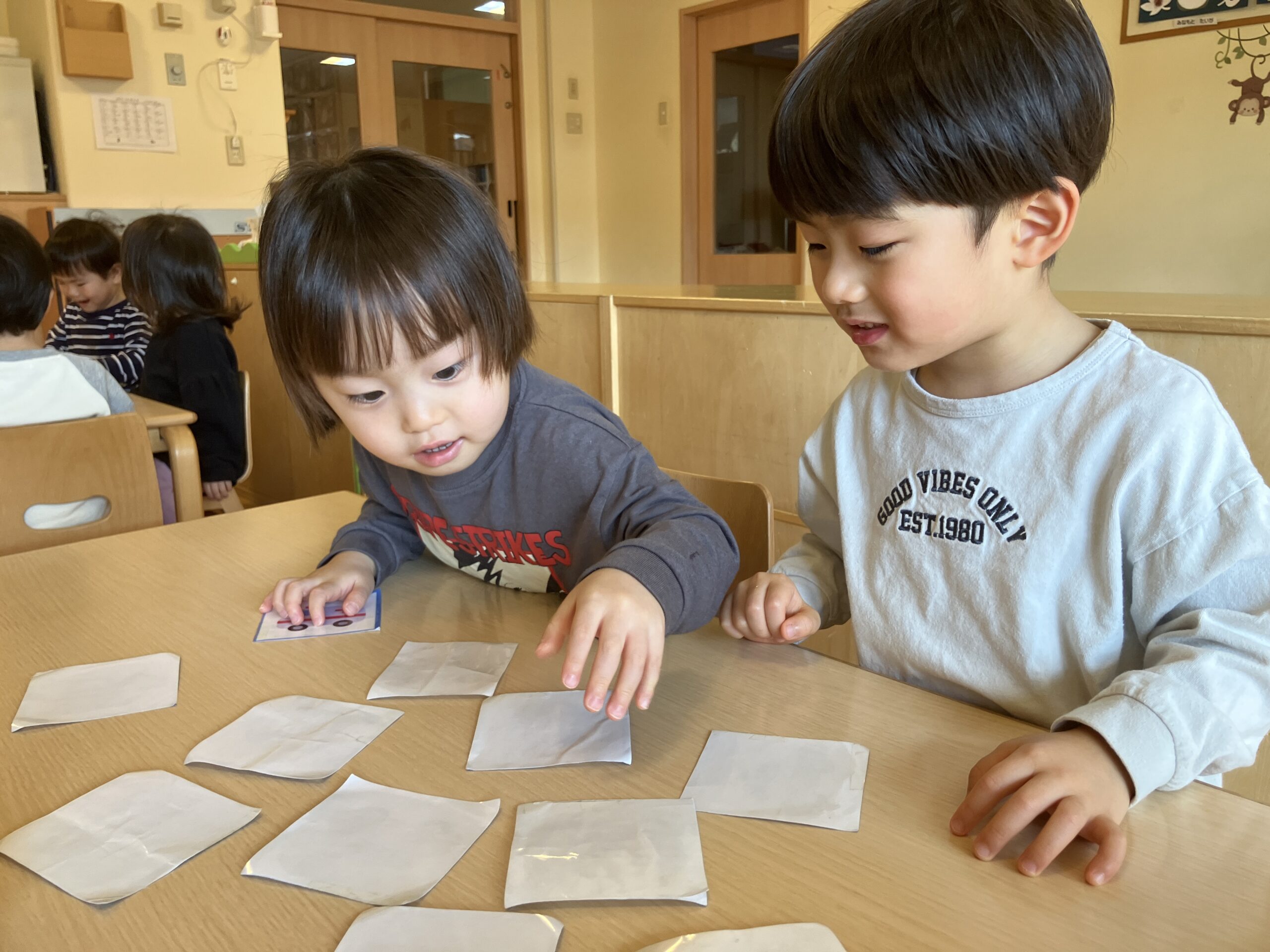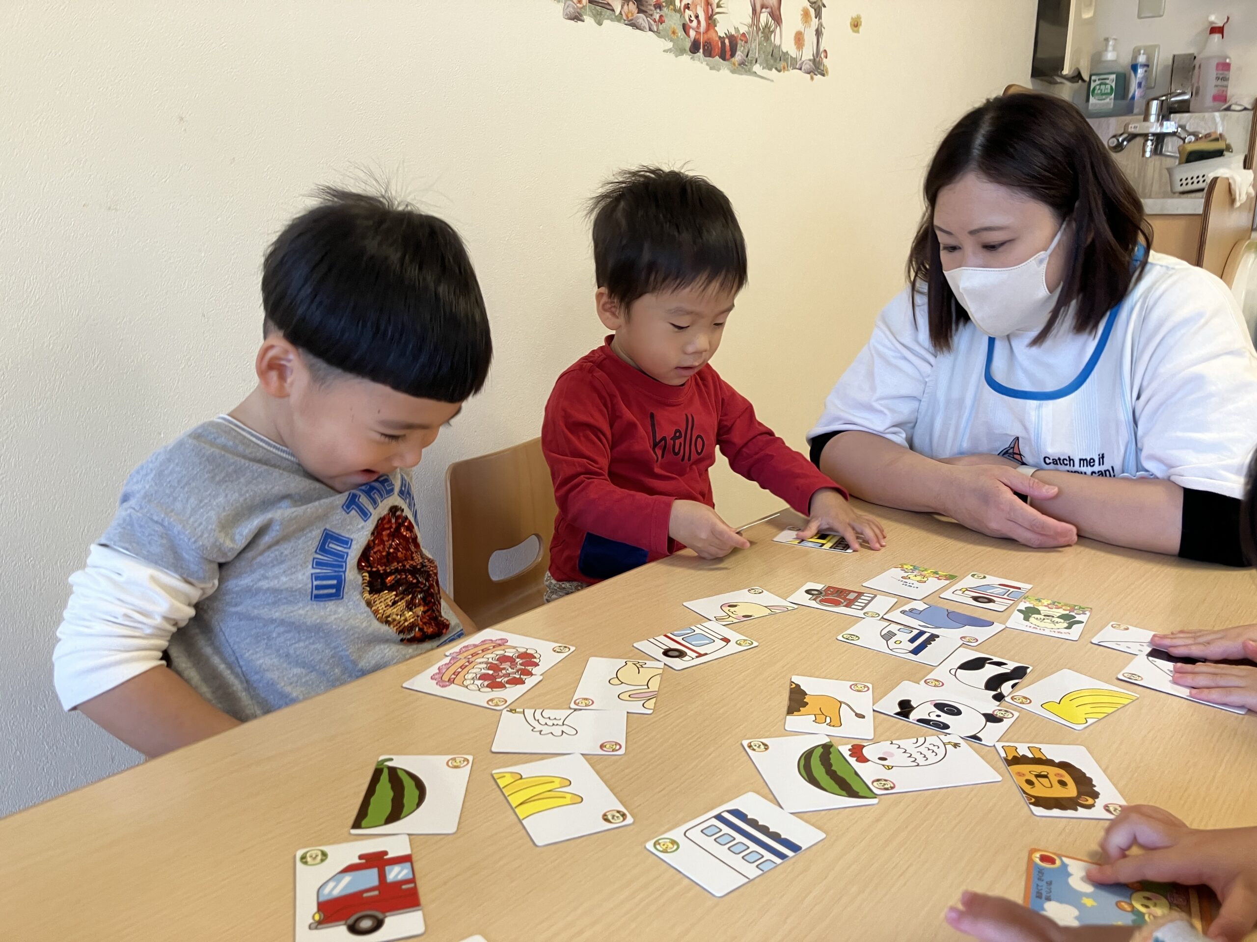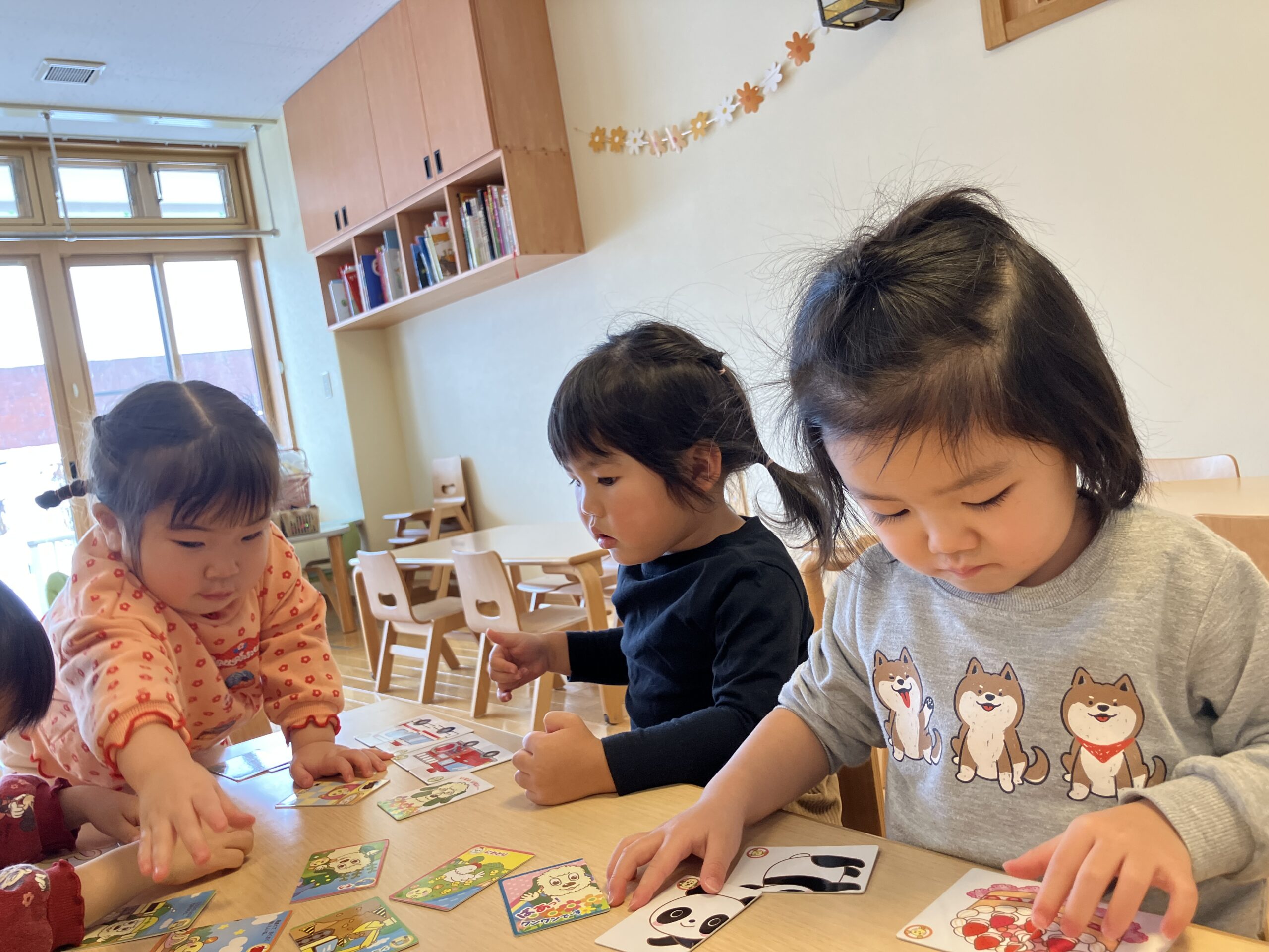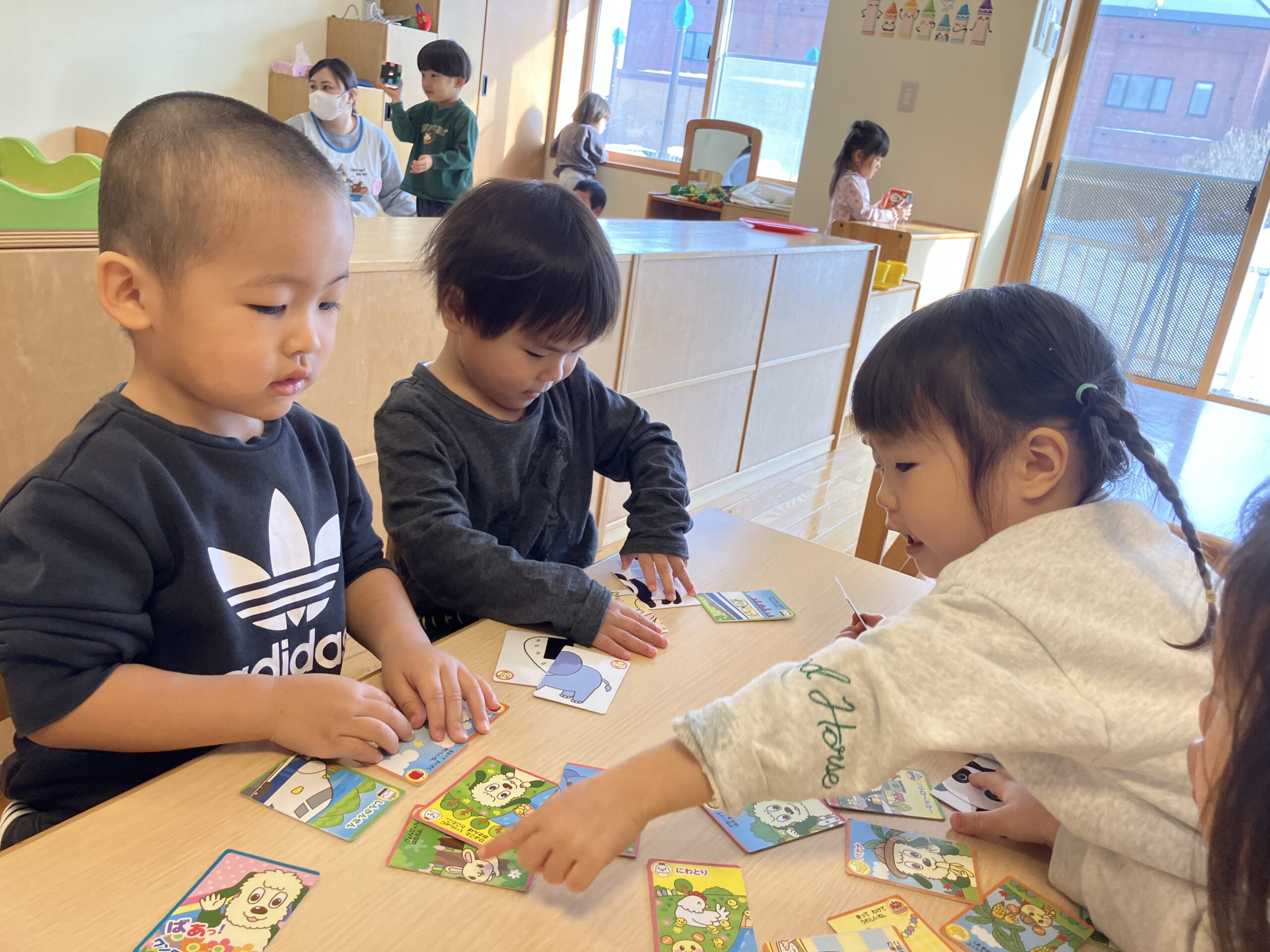 絵合わせカードが今きりん組では大人気!「先生今日もカードする?」「絵合わせカードしたーい!」と朝のおやつの時間からうきうきしています!じゃんけんをして順番にカードひき、カードの場所がわからないお友達がいる時には、みんなで一緒に探して揃えていました。ゲットしたカードを嬉しそうに持って保育者に見せてくれるきりん組さん。「それ何?」と聞くと「スイカ!」「ケーキ!」と描いている絵柄を元気に答えていましたよ。
