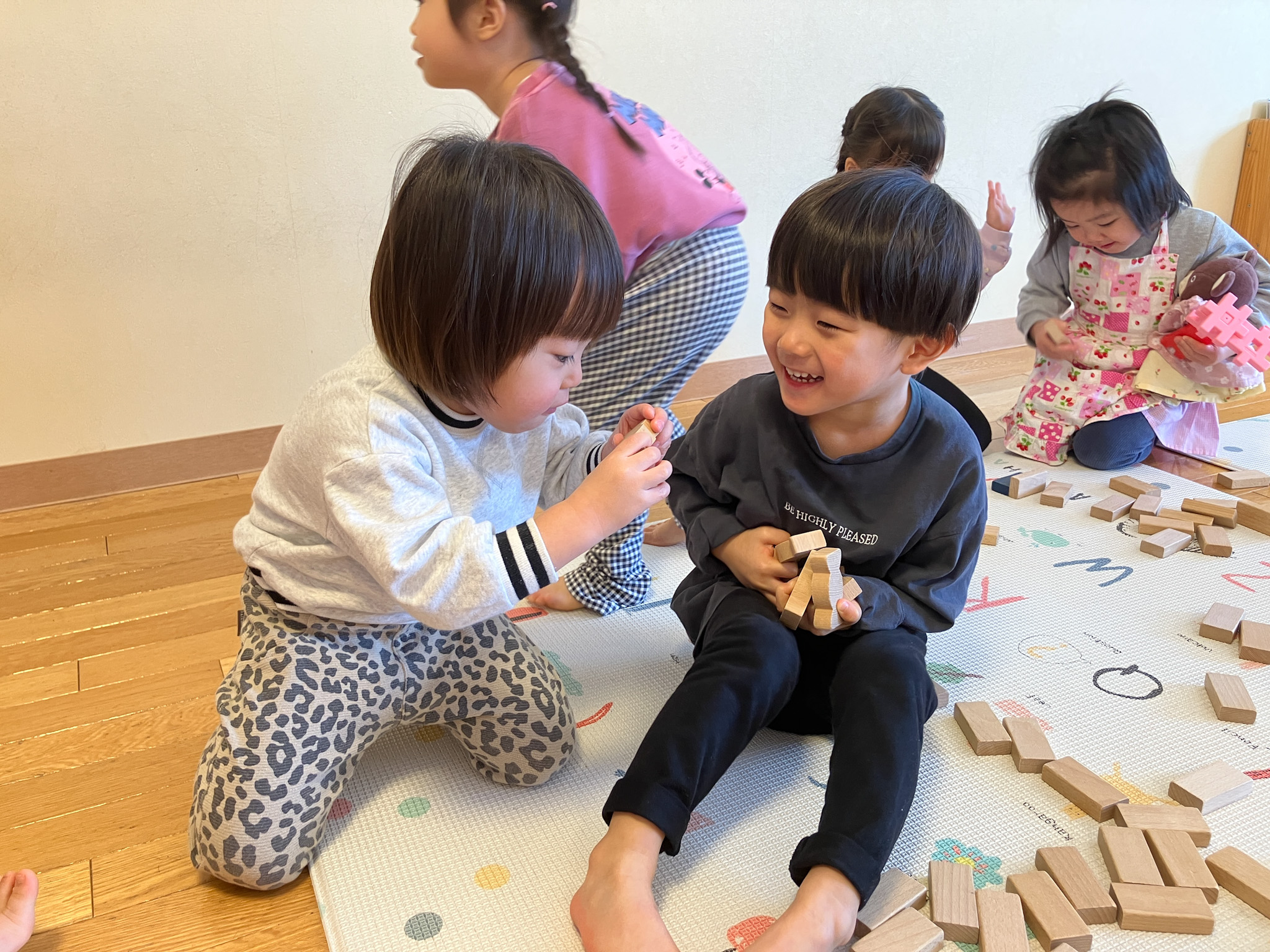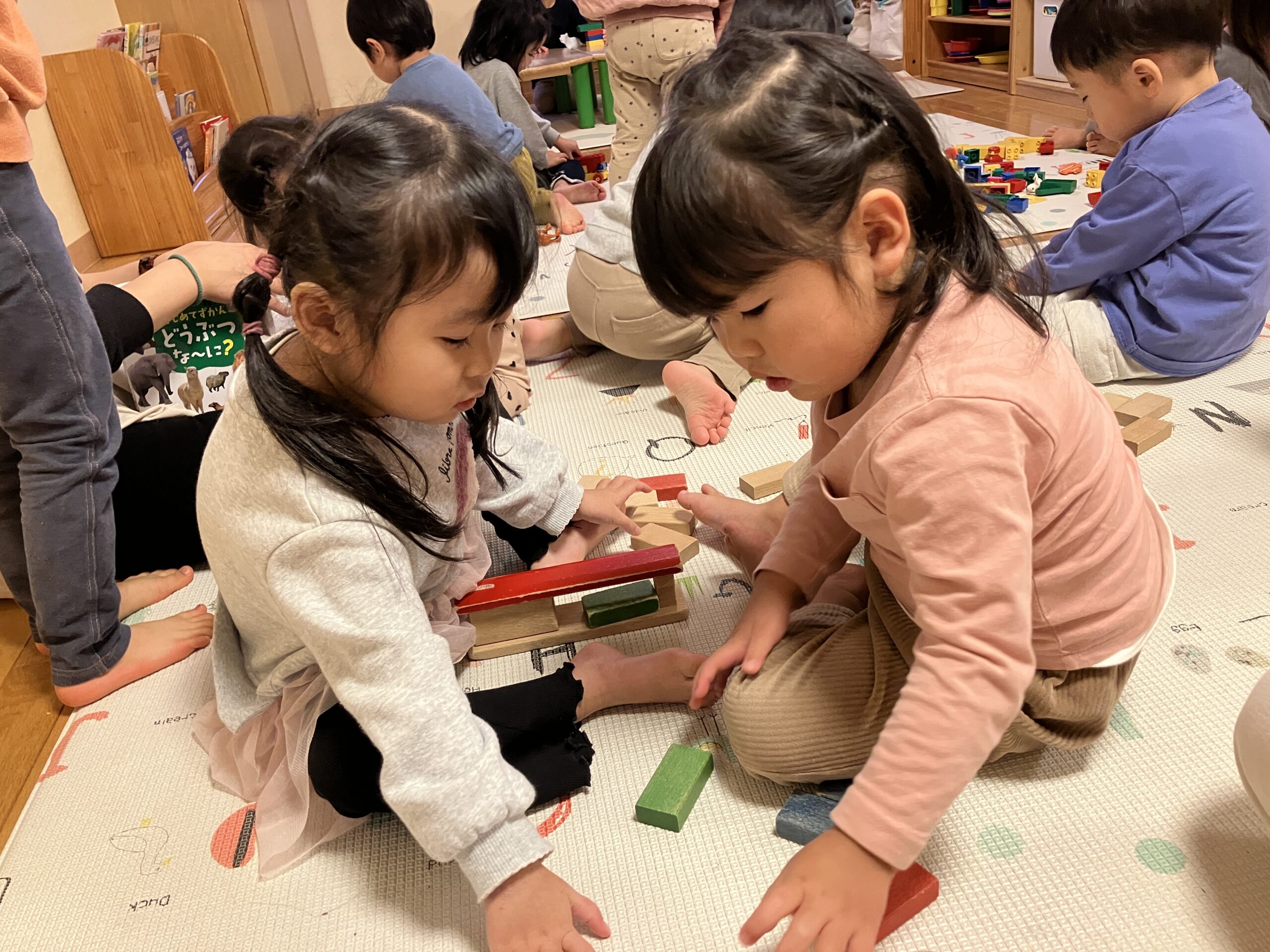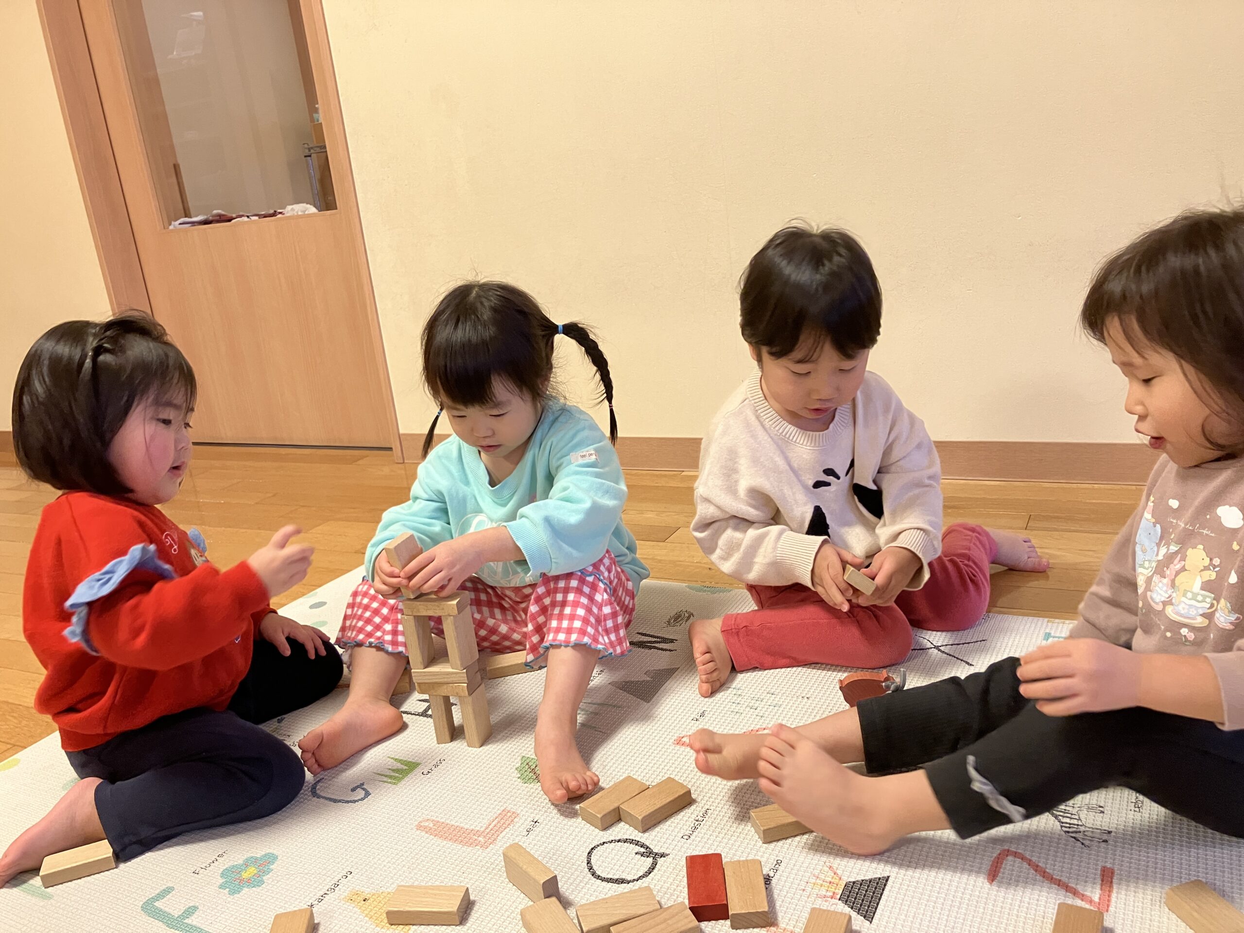 お花組さんにある積み木の玩具を借りて、積み木遊びをしました。上に高く積み上げ、倒れても何度も積み上げなおし、協力してお友達と城を作ってみたり、床に1個づつ並べ、ドミノ倒しをして楽しんでいました。キャンディーの形の積み木や色のついた積み木を集めてお菓子屋さんとして楽しむ子もいましたよ!