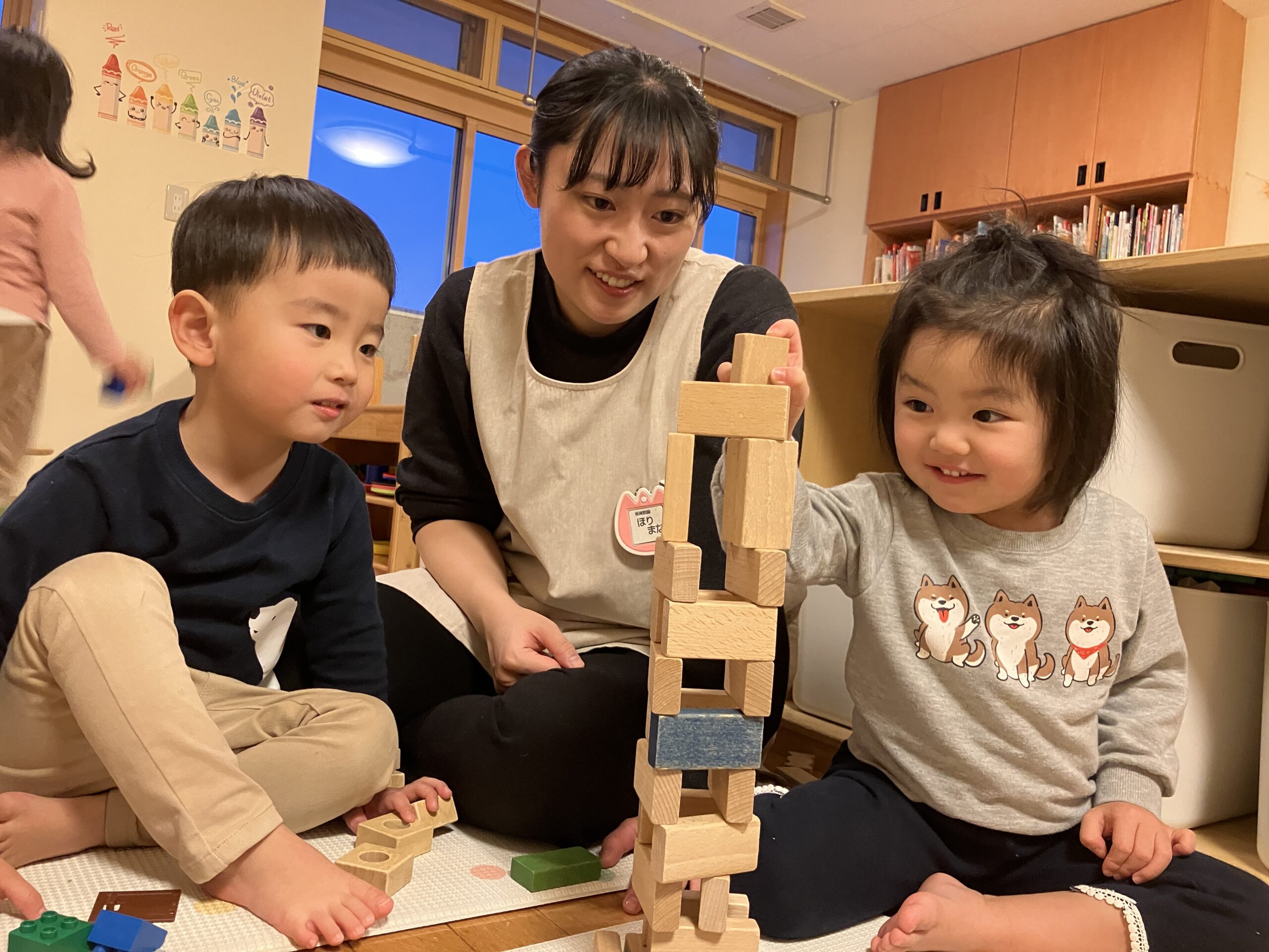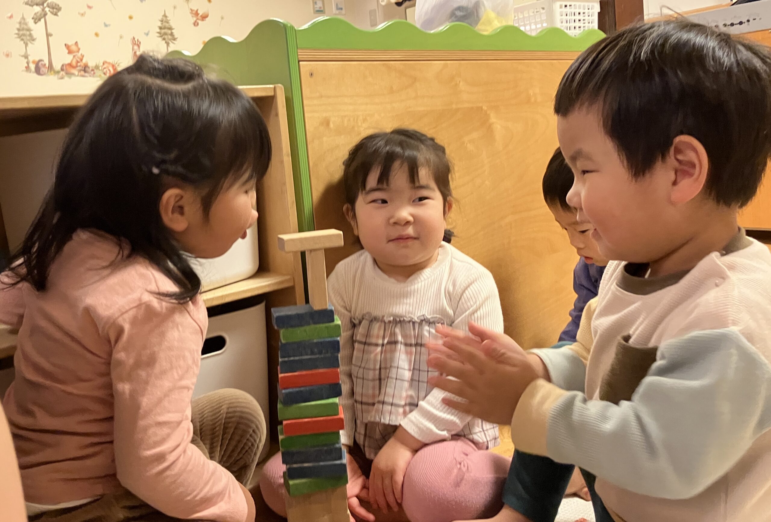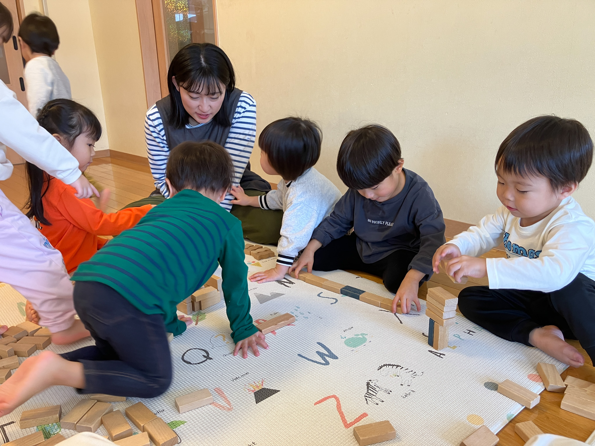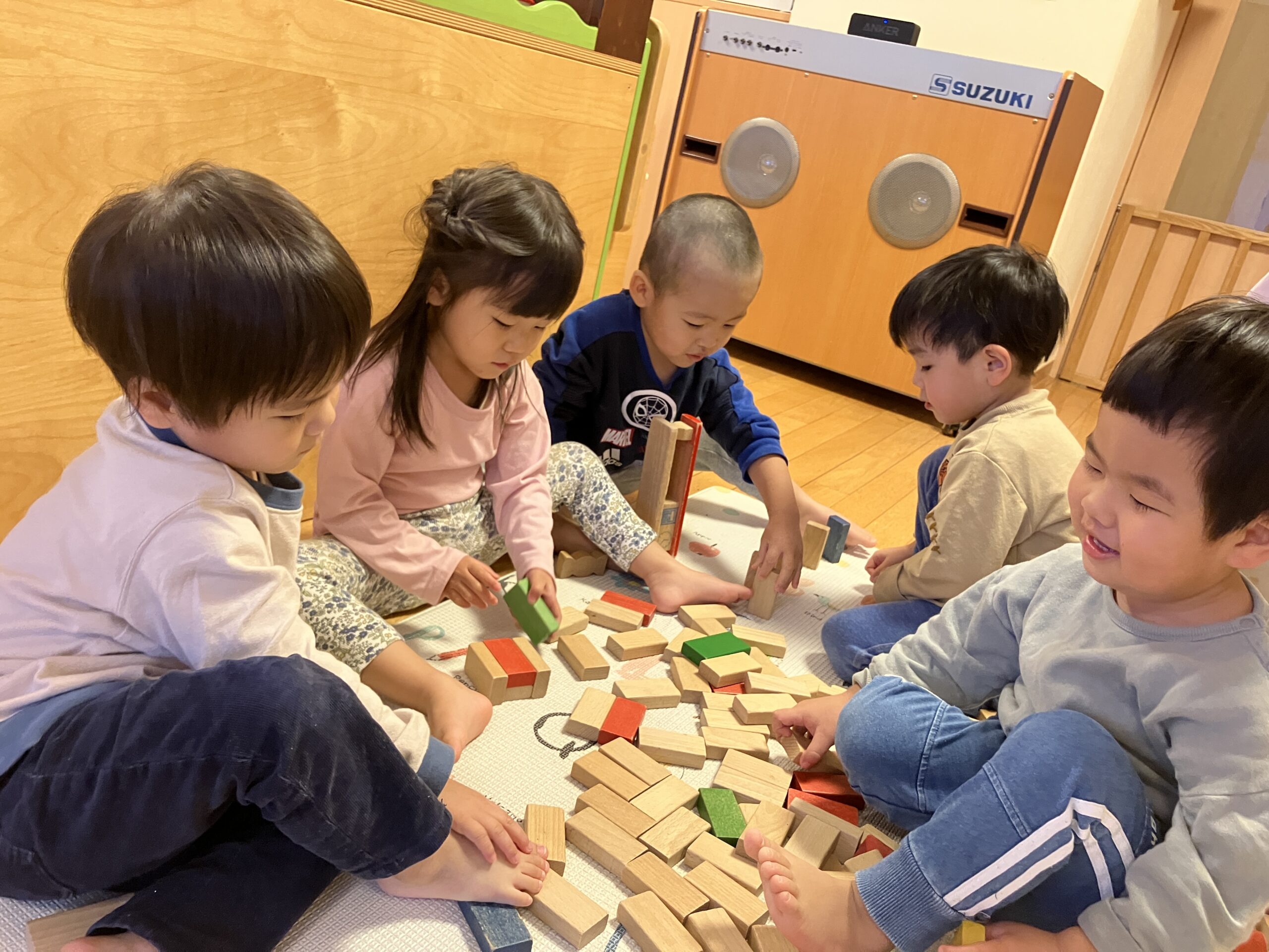お花組さんにある積み木の玩具を借りて、積み木遊びをしました。上に高く積み上げ、倒れても何度も積み上げなおし、協力してお友達と城を作ってみたり、床に1個づつ並べ、ドミノ倒しをして楽しんでいました。キャンディーの形の積み木や色のついた積み木を集めてお菓子屋さんとして楽しむ子もいましたよ!