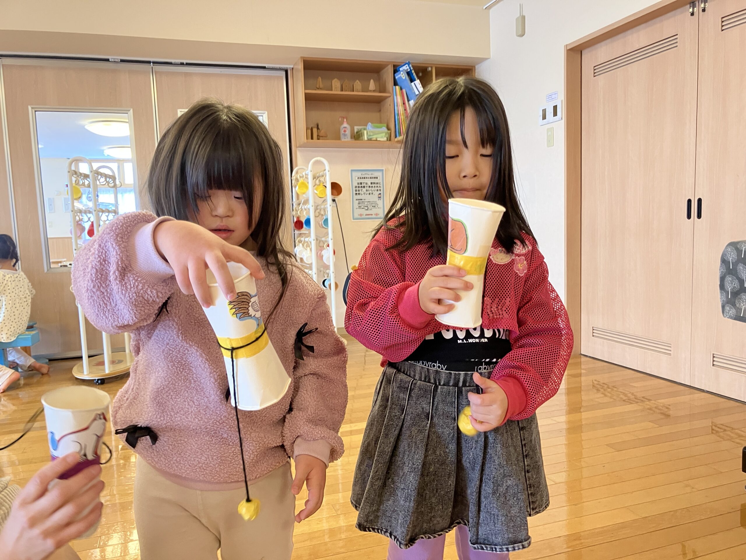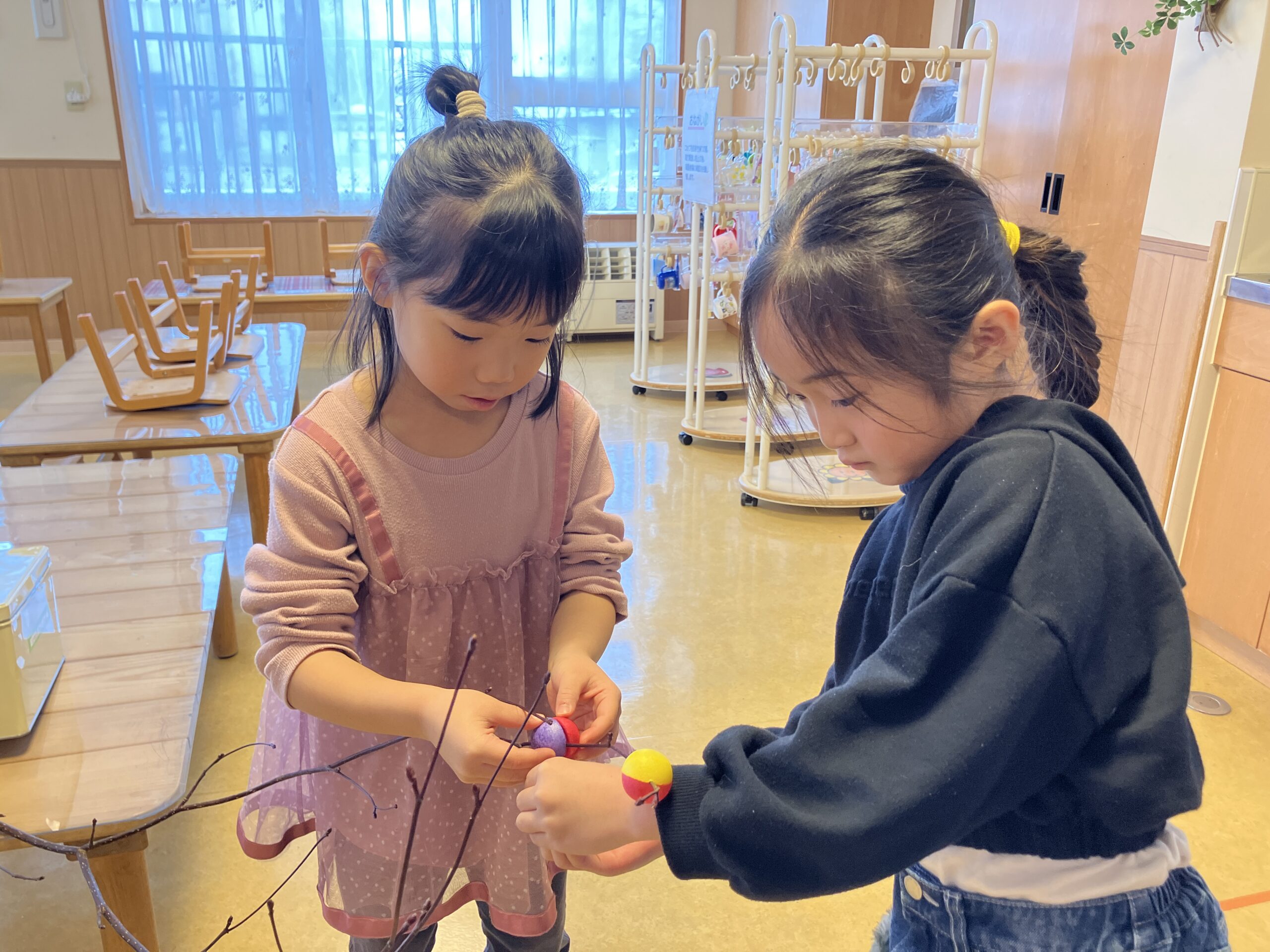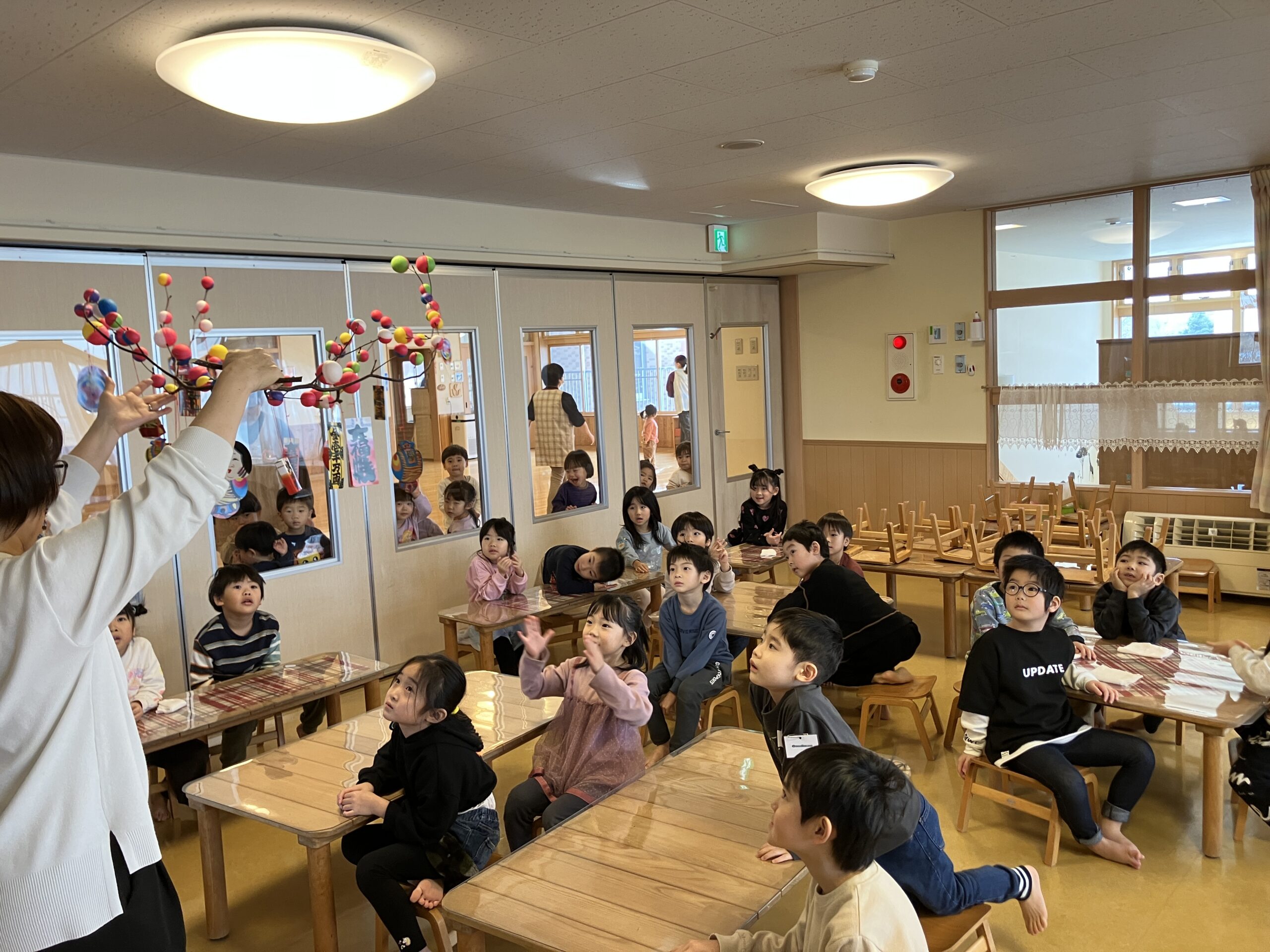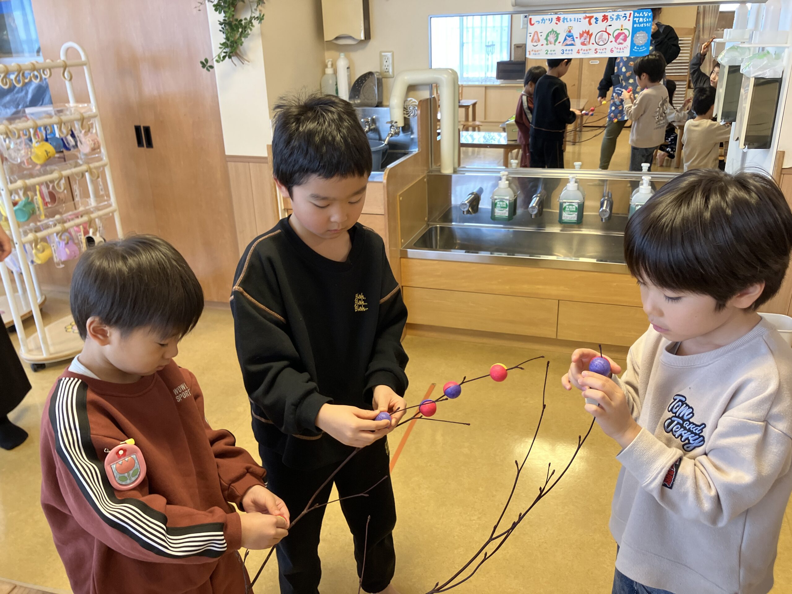 お正月ならではの遊び、羽子板やこま、ししまいなど、友だちと一緒に挑戦し、「できた!」「もう一回!」と、笑顔いっぱい遊ぶ姿が見られました。また、園長先生と一緒に舞玉作りも行い、完成した舞玉は玄関に綺麗に飾りました。「なんで作るの?」「どんな意味があるの?」と興味津々の子どもたち。健康や豊作への願いが込められていることを教えてもらいながら、楽しく取り組みました。日本の伝統に親しむ貴重な時間となりました😊