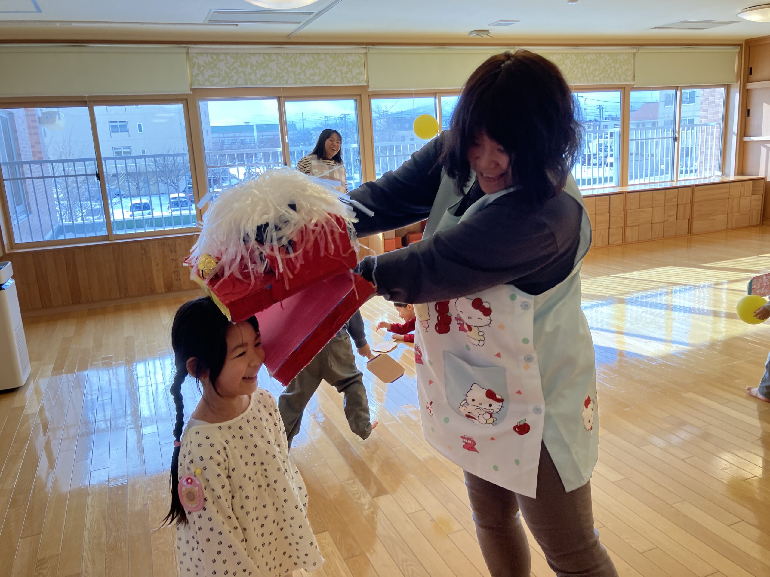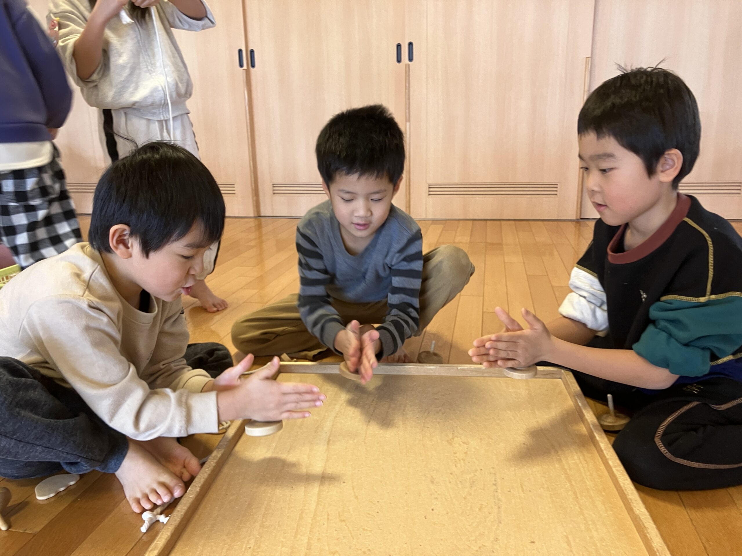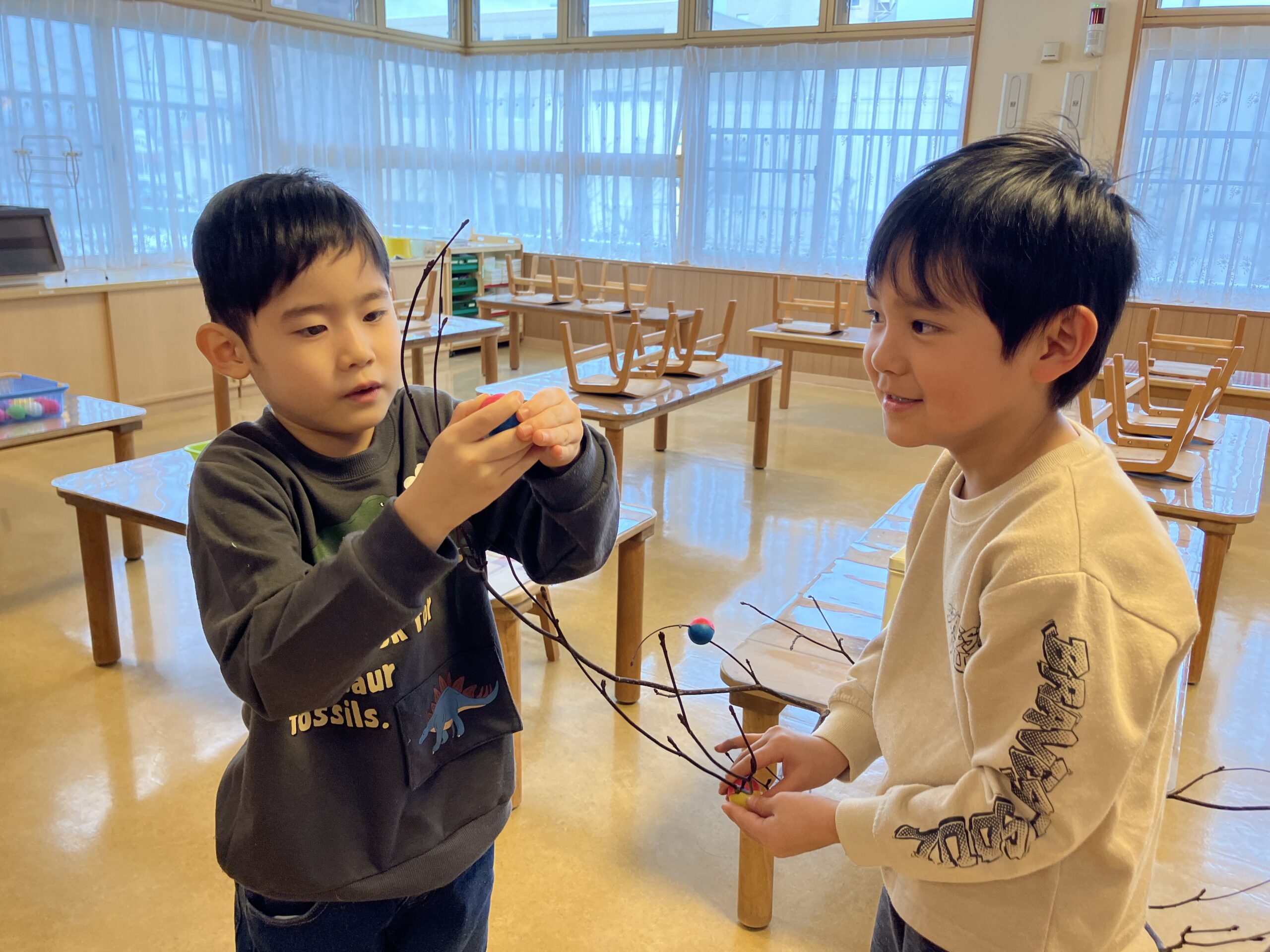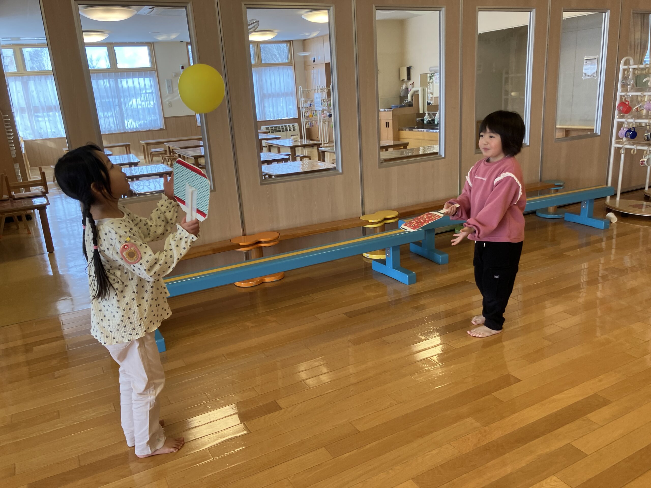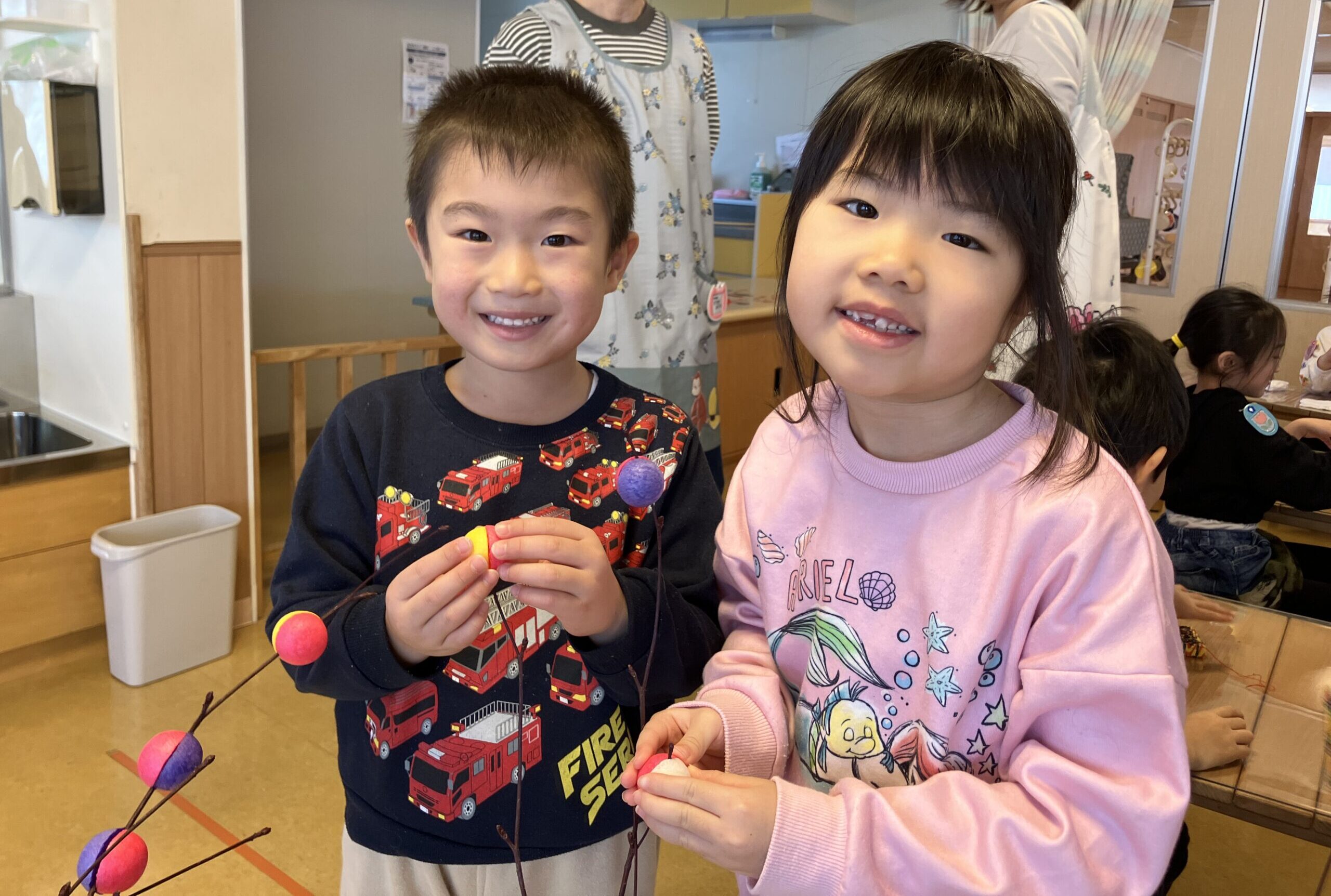 お正月ならではの遊び、羽子板やこま、ししまいなど、友だちと一緒に挑戦し、「できた!」「もう一回!」と、笑顔いっぱい遊ぶ姿が見られました。また、園長先生と一緒に舞玉作りも行い、完成した舞玉は玄関に綺麗に飾りました。「なんで作るの?」「どんな意味があるの?」と興味津々の子どもたち。健康や豊作への願いが込められていることを教えてもらいながら、楽しく取り組みました。日本の伝統に親しむ貴重な時間となりました😊