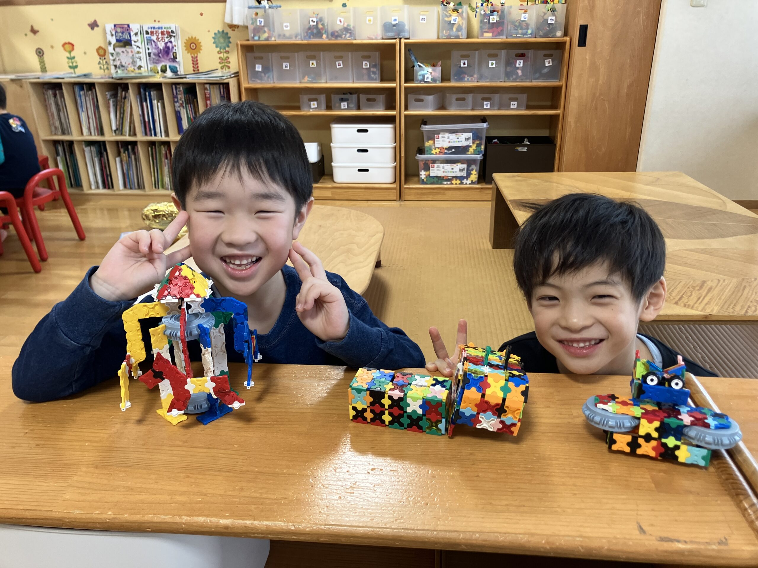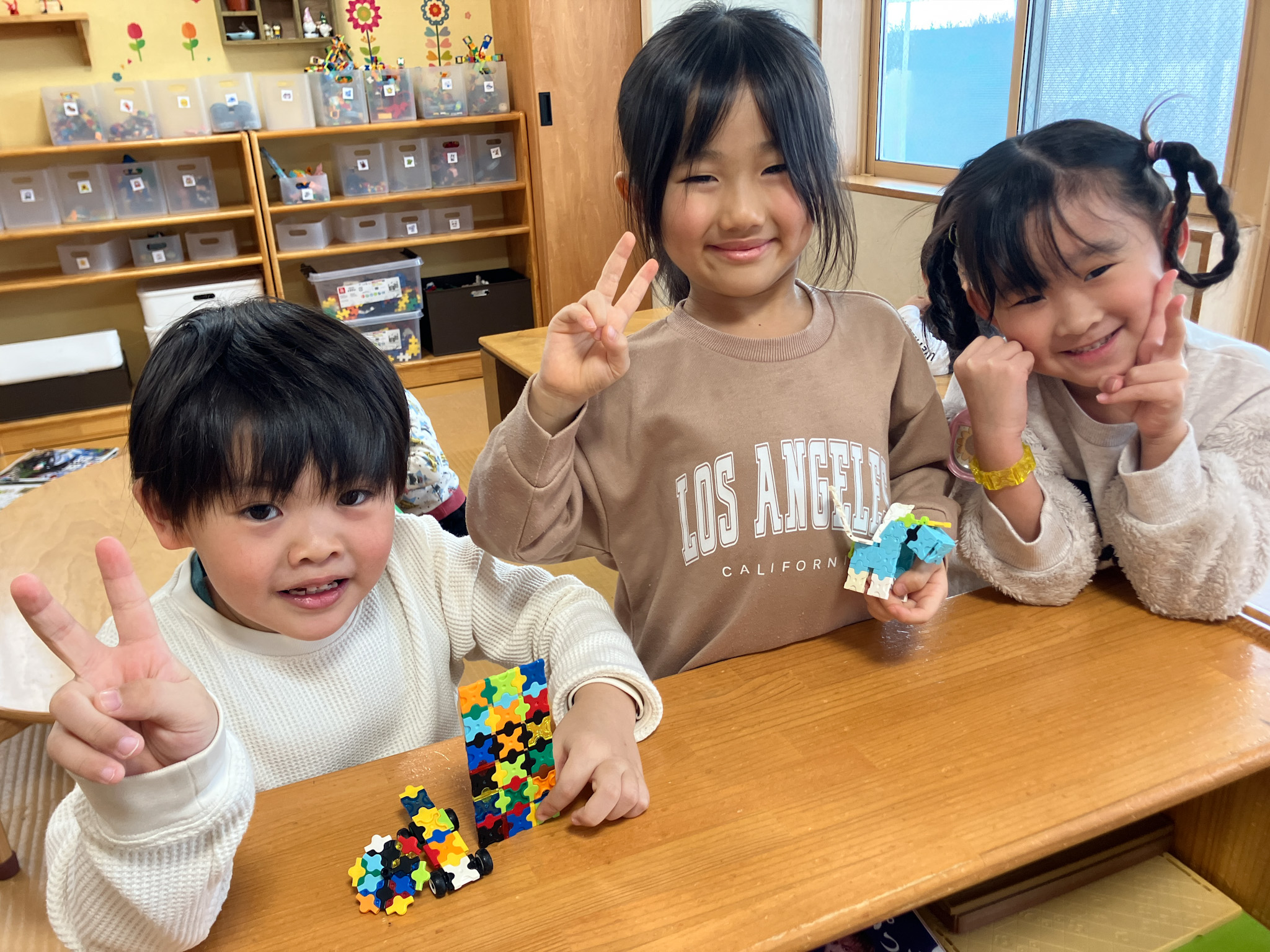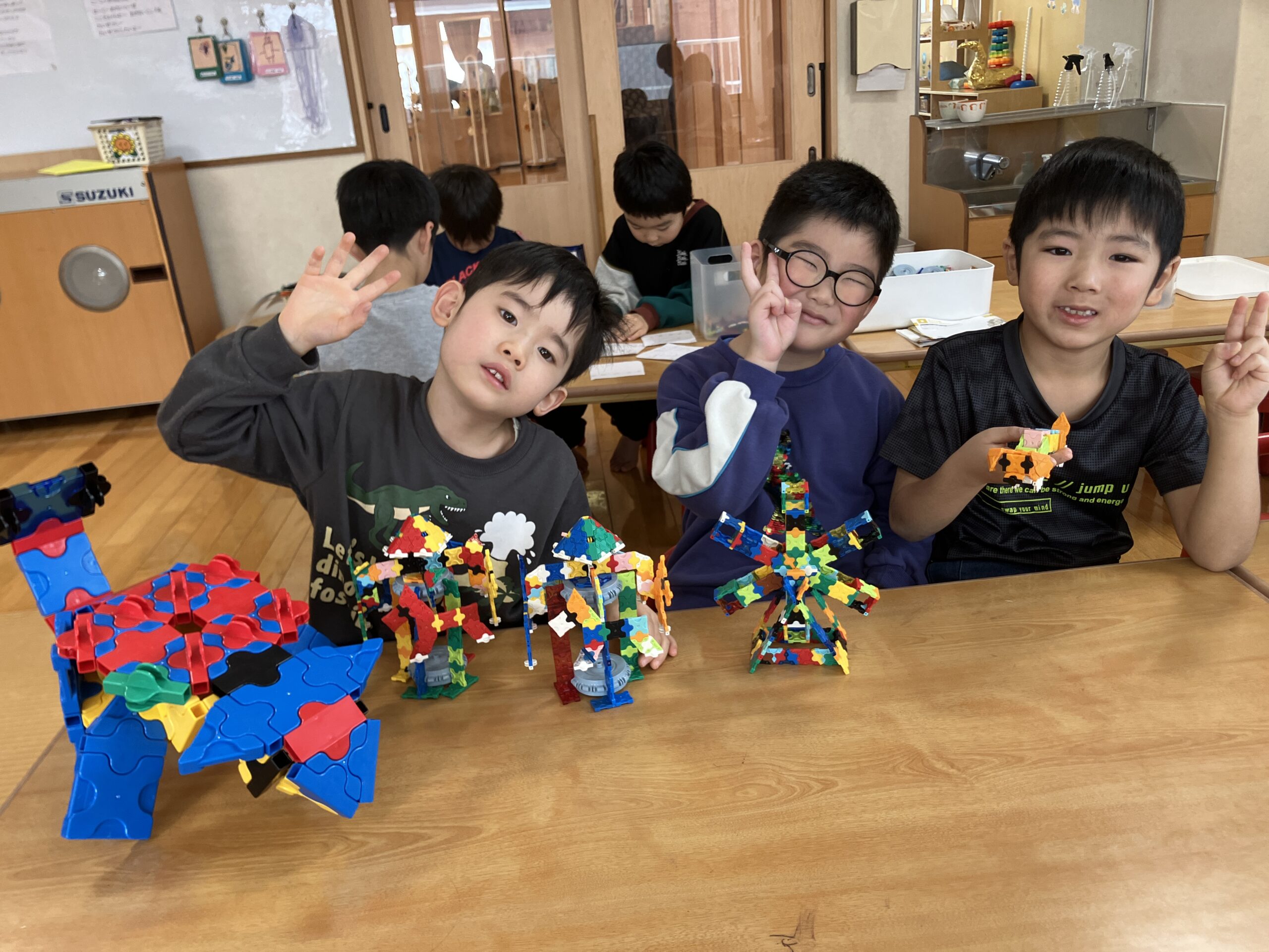 LaQ遊びを通して、説明書を理解し、立体的な構成を考えながら作品を作れるようになってきました。友だちの作品を見て「すごいね!」「どうやって作ったの?」と刺激を受ける姿も見られています。また、「ここどうやるの?」「こうやってつけるんだよ」と教え合ったり、見本を見せ合ったりしながら、友達同士で協力して作り進める姿も増えてきました。完成した作品は、走らせたり回したり、ごっこ遊びに使ったりと、遊びがさらに広がっていますよ。