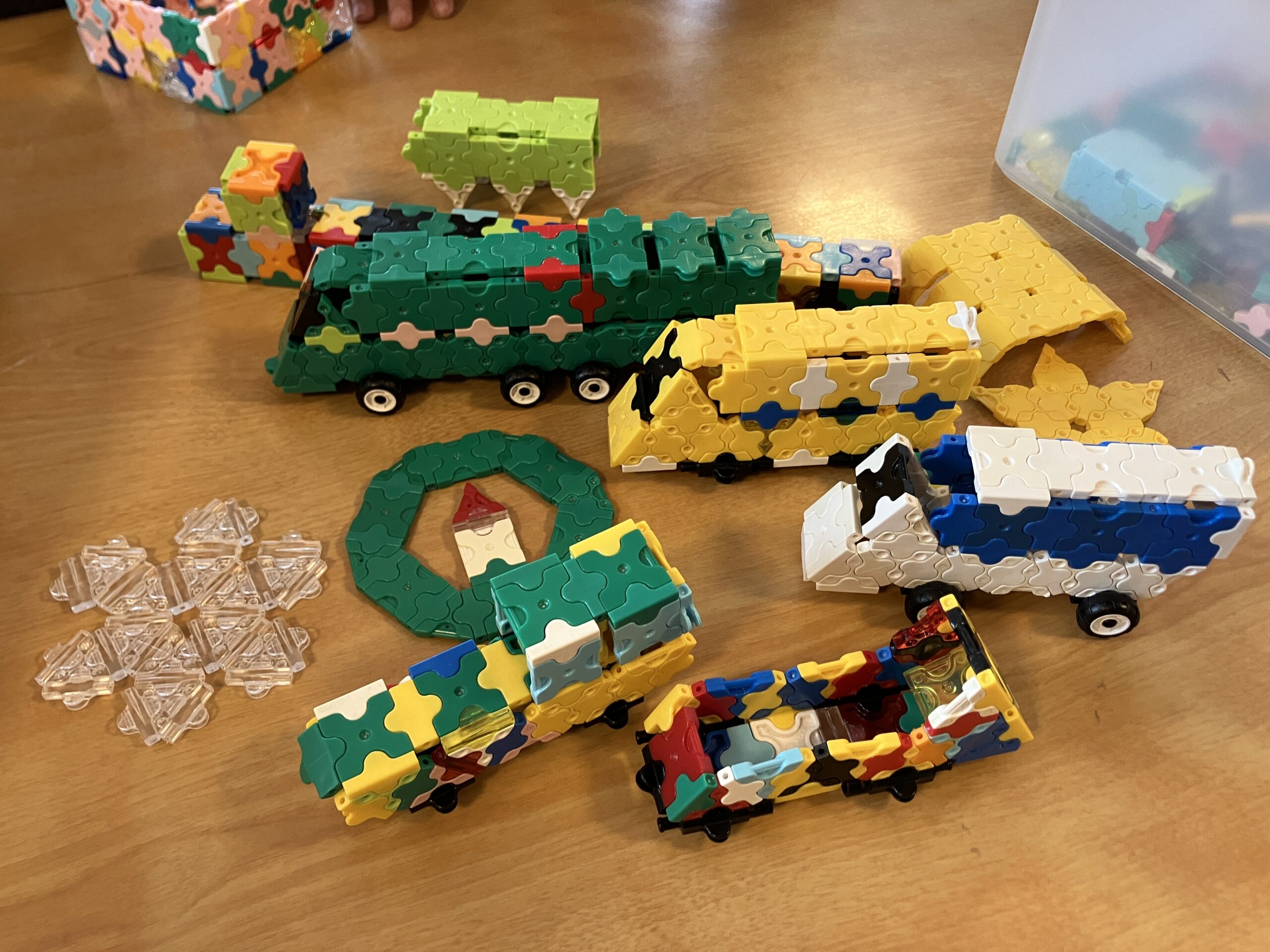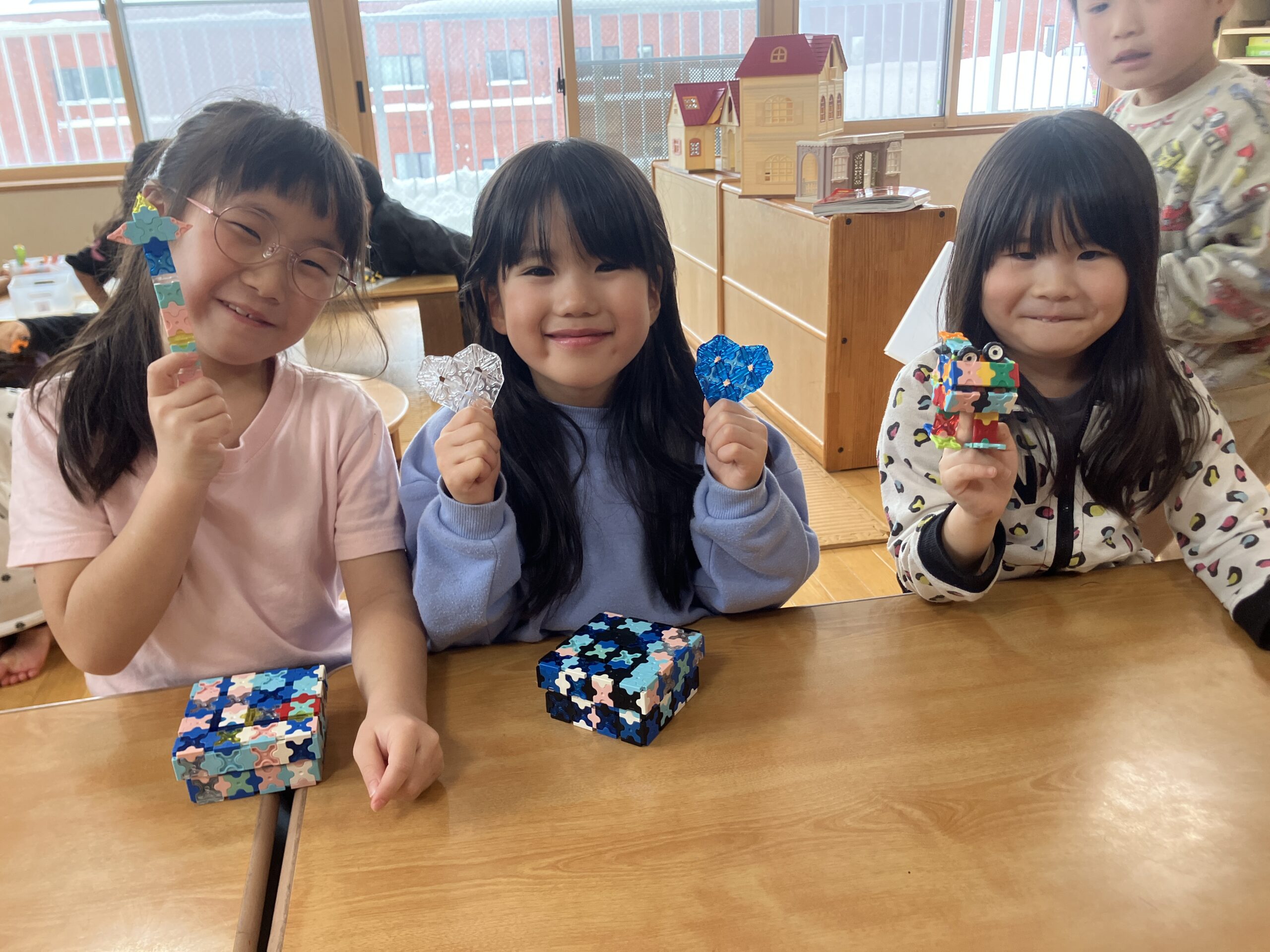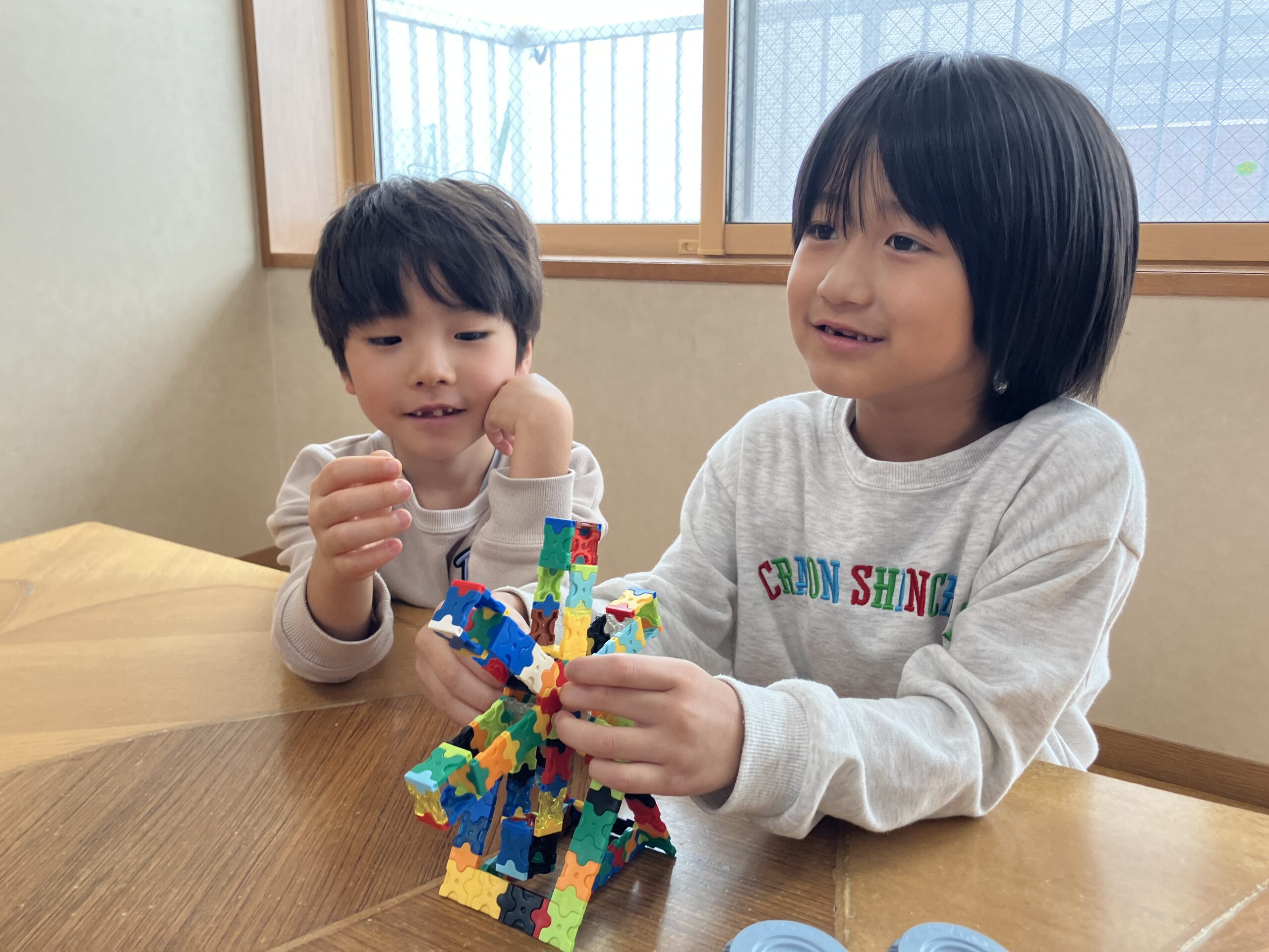 LaQ遊びを通して、説明書を理解し、立体的な構成を考えながら作品を作れるようになってきました。友だちの作品を見て「すごいね!」「どうやって作ったの?」と刺激を受ける姿も見られています。また、「ここどうやるの?」「こうやってつけるんだよ」と教え合ったり、見本を見せ合ったりしながら、友達同士で協力して作り進める姿も増えてきました。完成した作品は、走らせたり回したり、ごっこ遊びに使ったりと、遊びがさらに広がっていますよ。