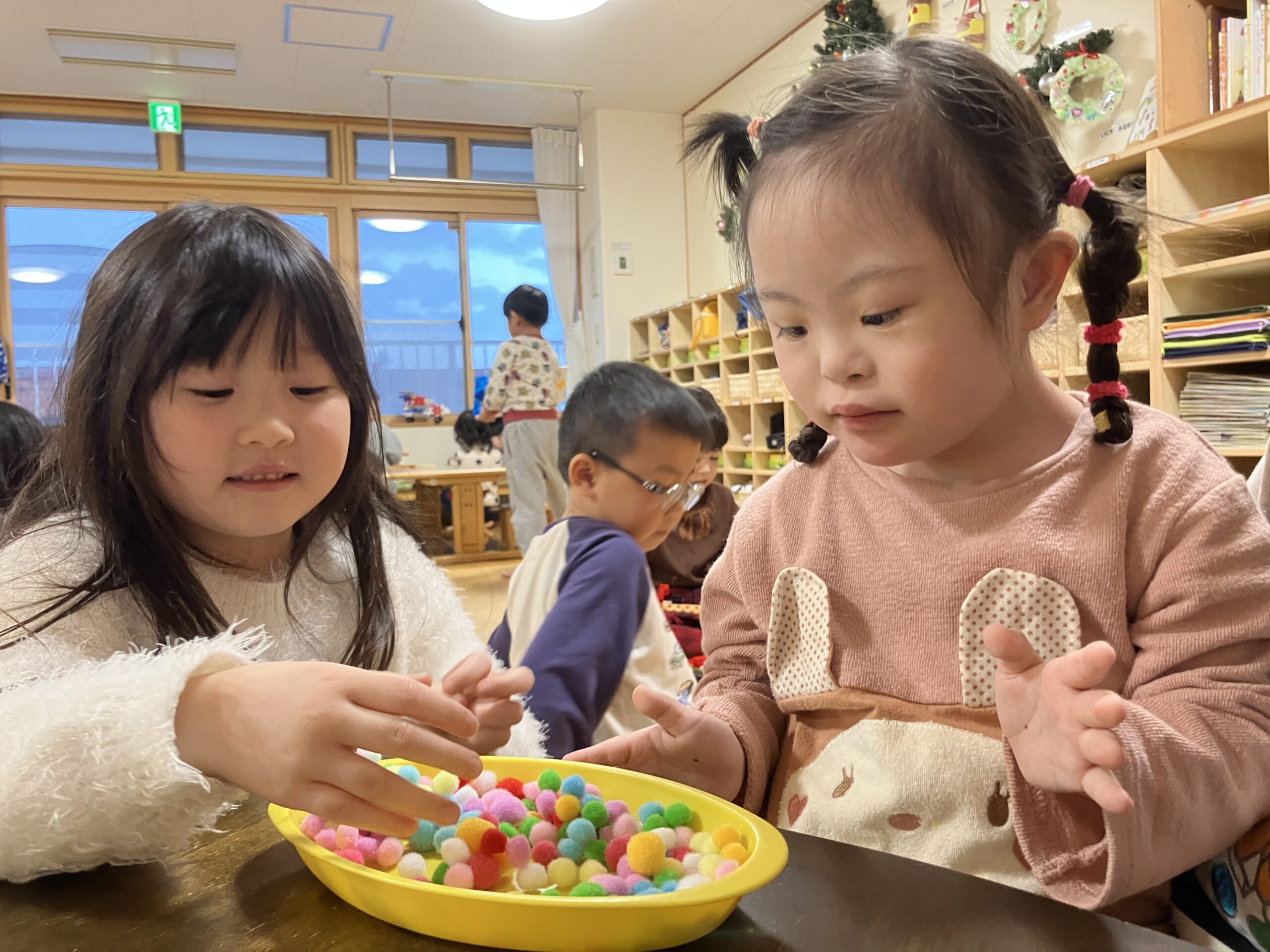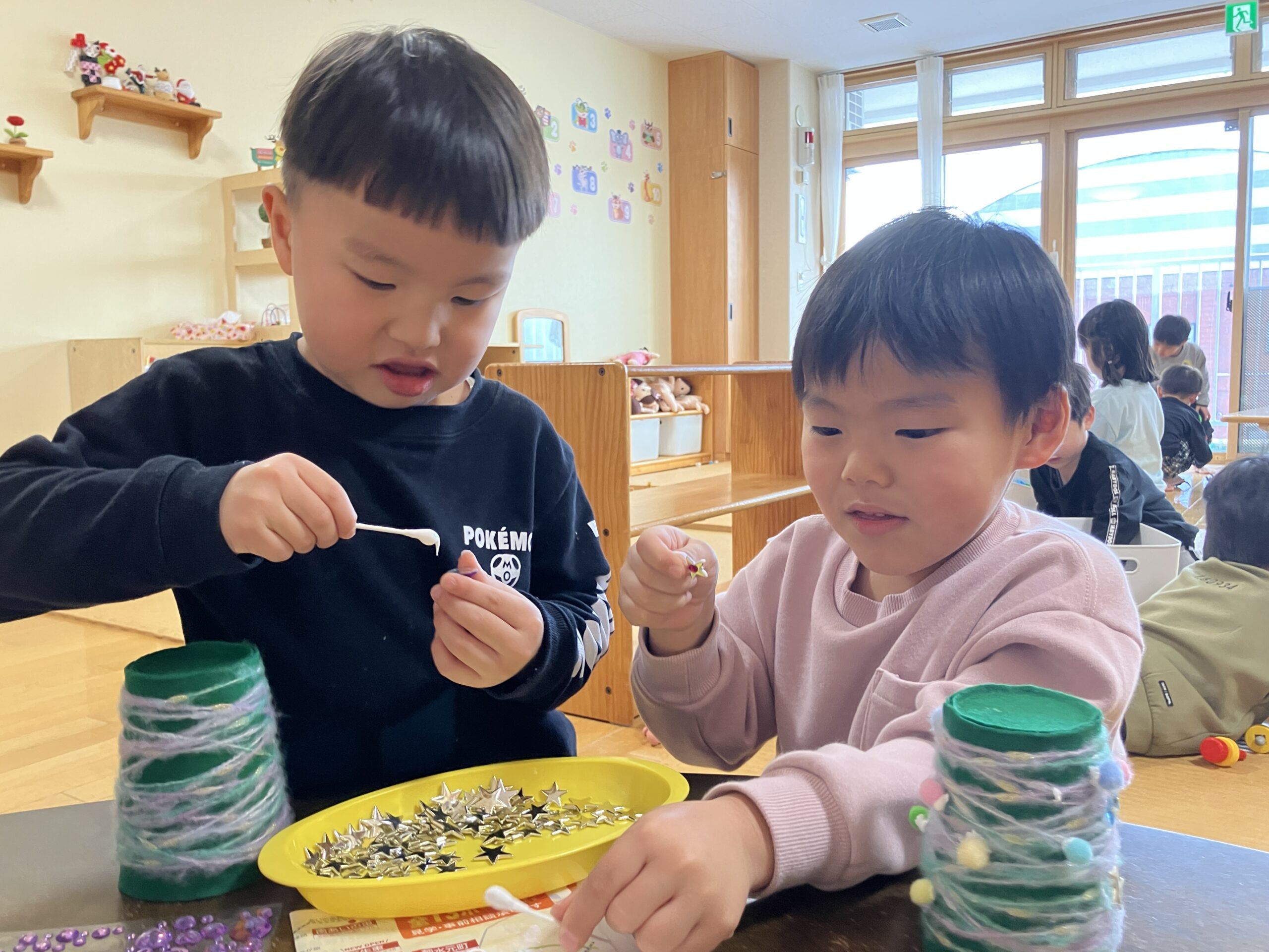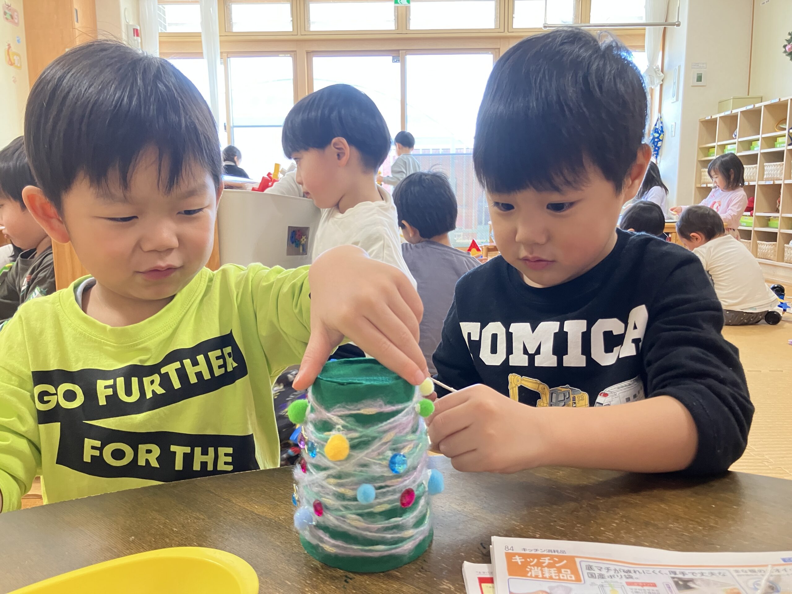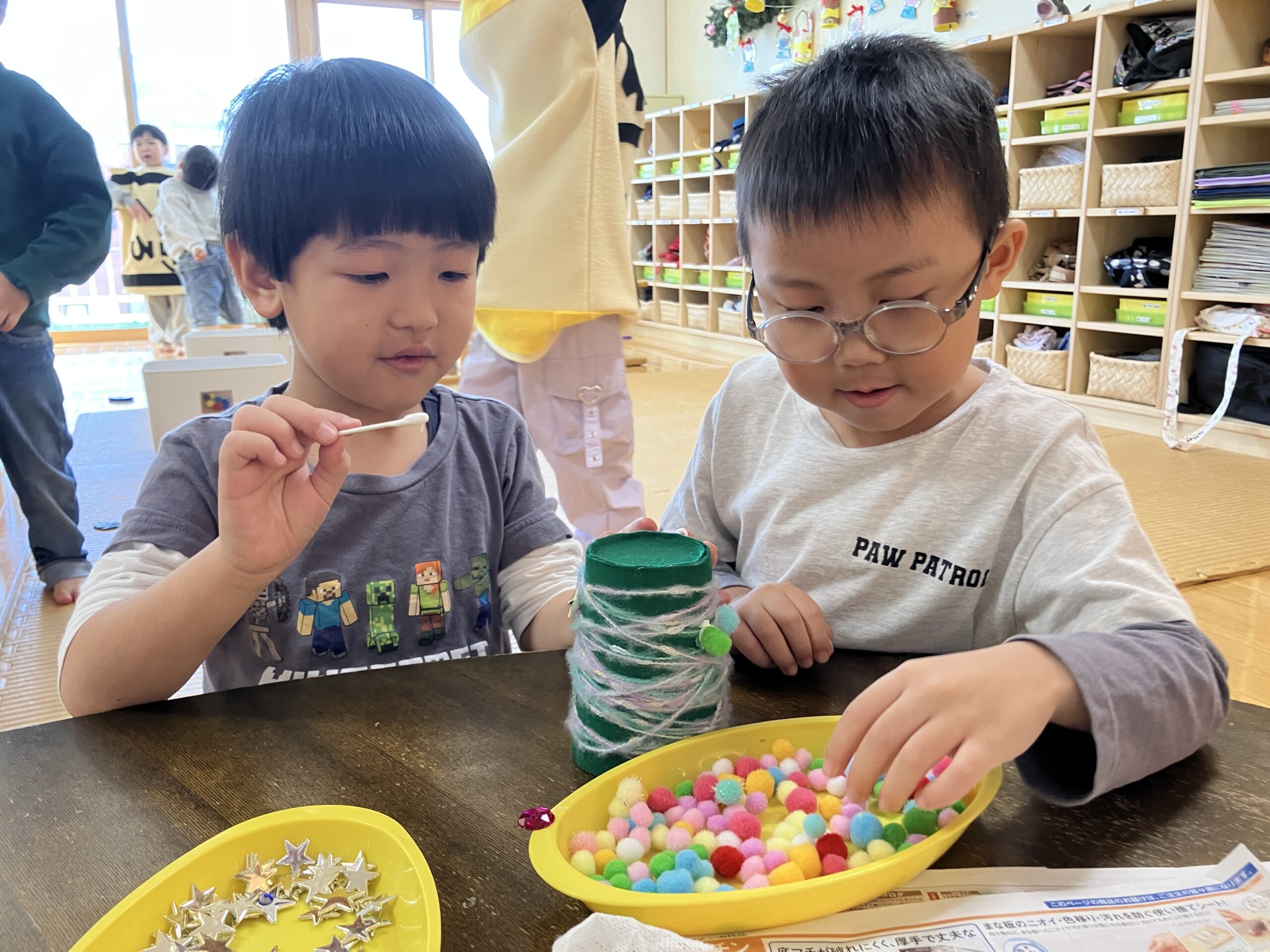 ツリーにポンポンをつけたり、キラキラしたシールを貼ったり、思い思いに模様を付けて楽しんでいました✨