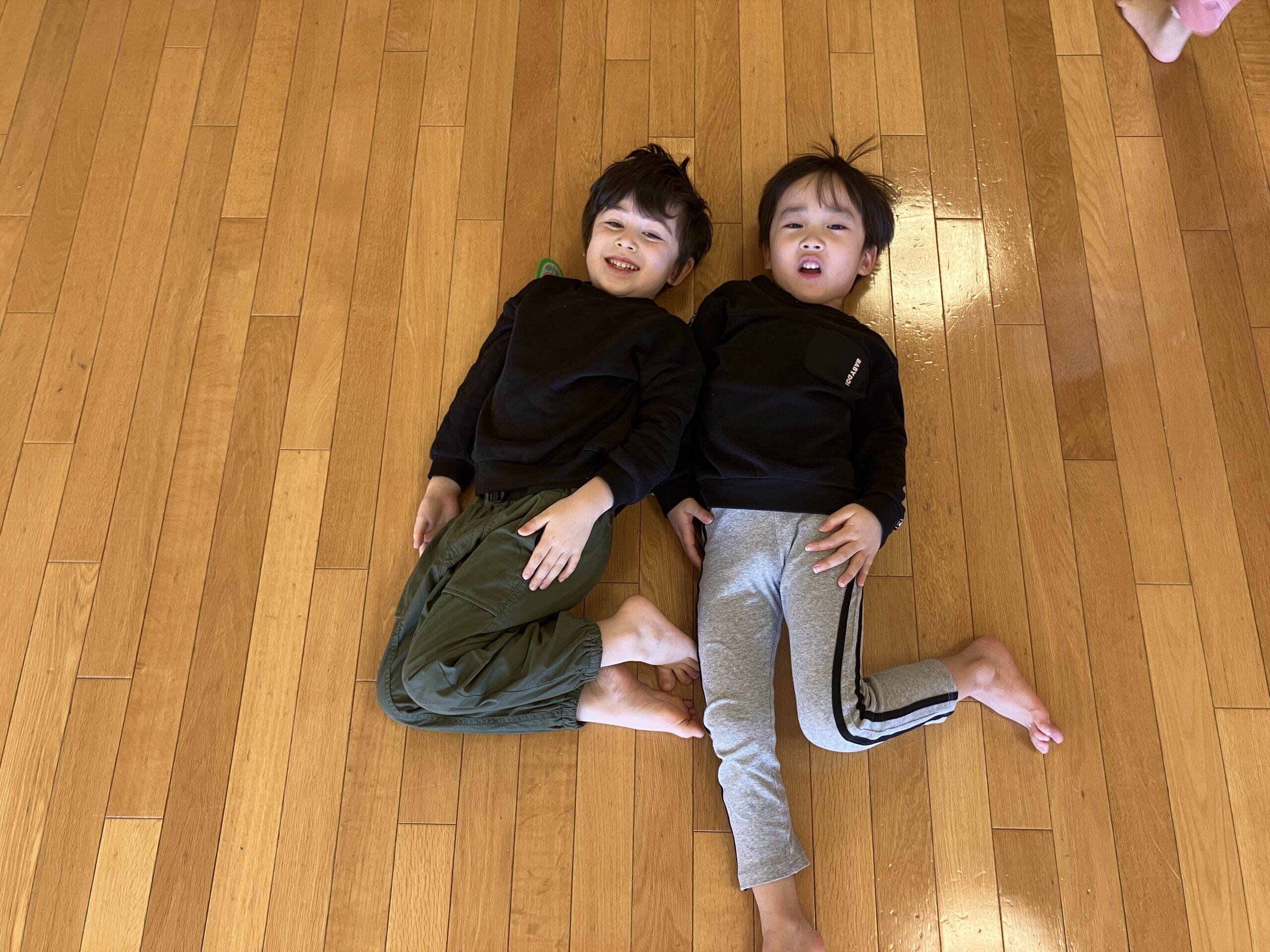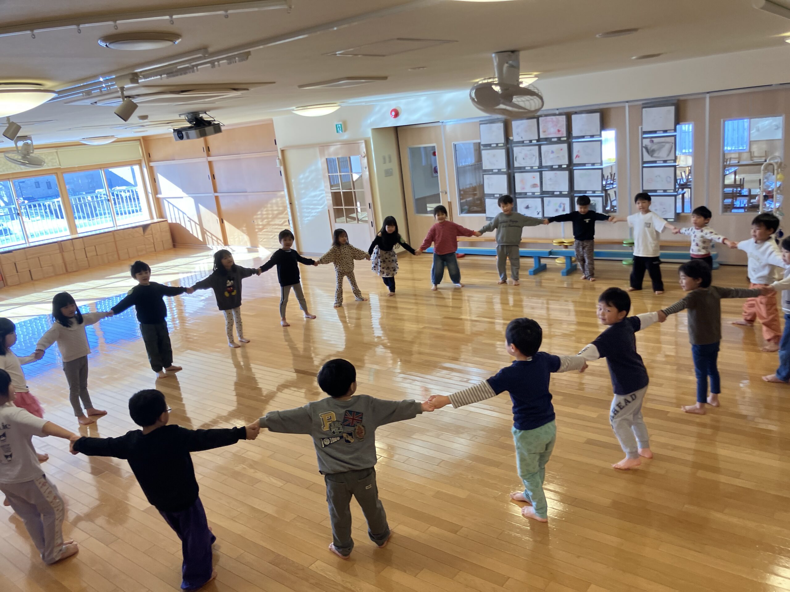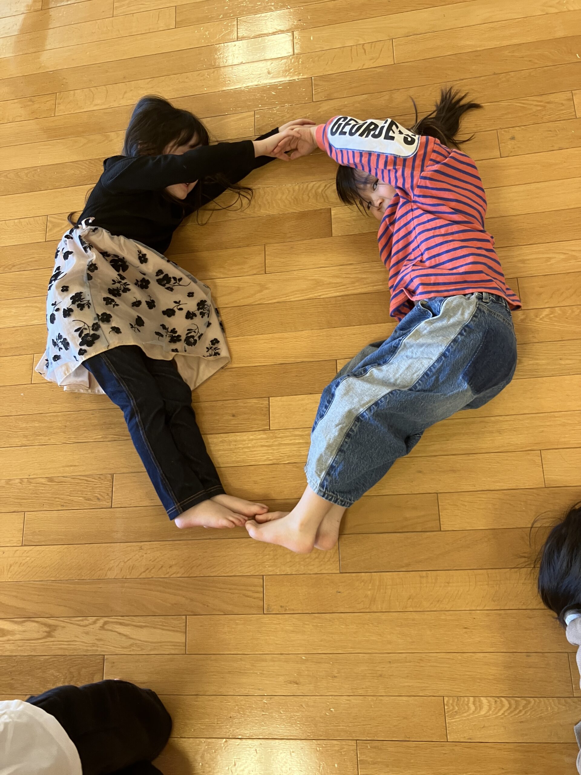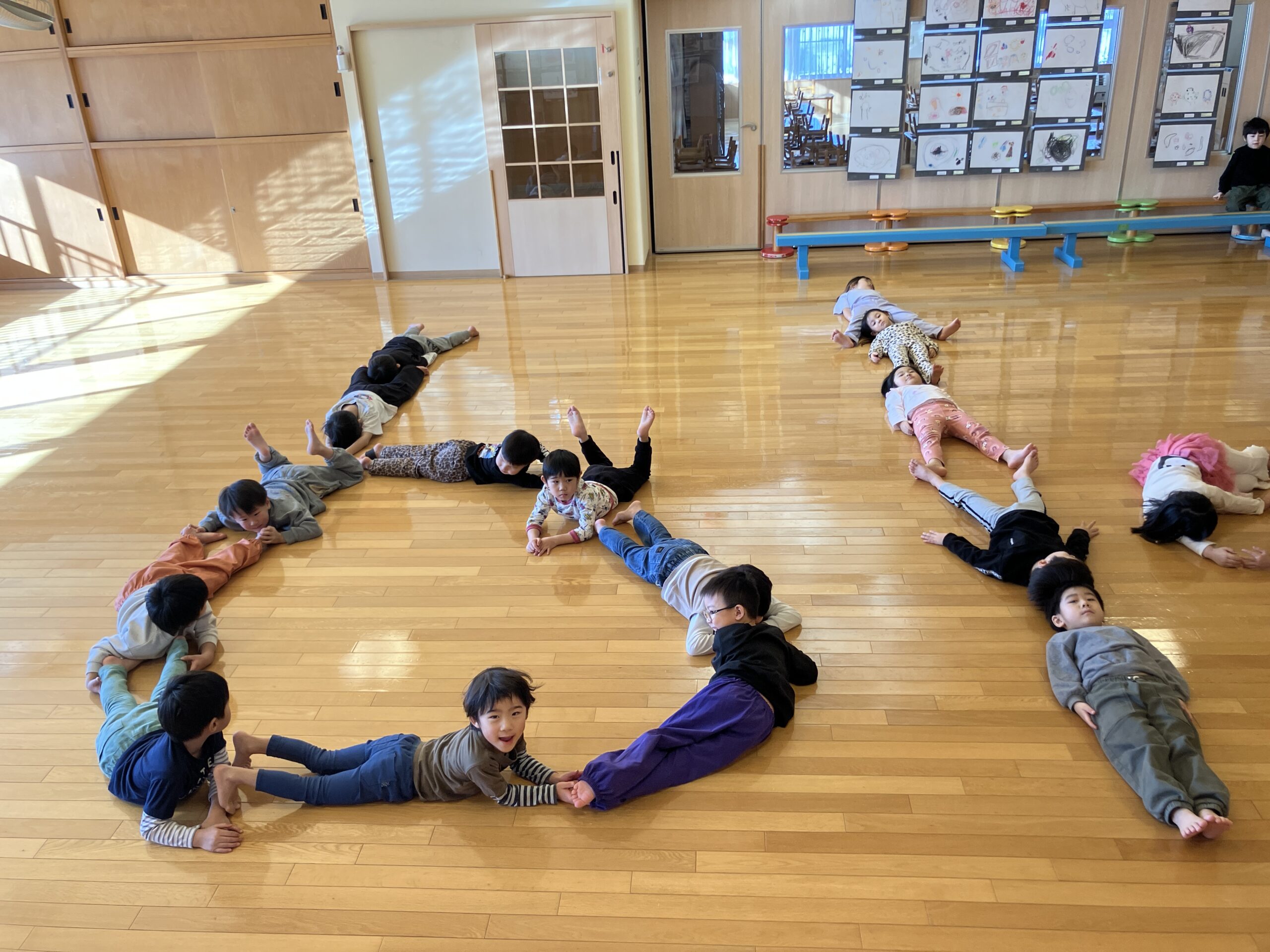 そこから、人数を増やしてさらに大きな数字作りに発展!寝転んでみたり、友だち同士で見せ合いっこしたりと、遊びながら数字の形を楽しんでいました。「みんなで0を作ろう~集まって!」と子どもたち同士で声を掛け合い、手をつないで大きな丸を作ることに。「0が完成したよ!!」と、とても嬉しそうな表情を見せてくれました😊