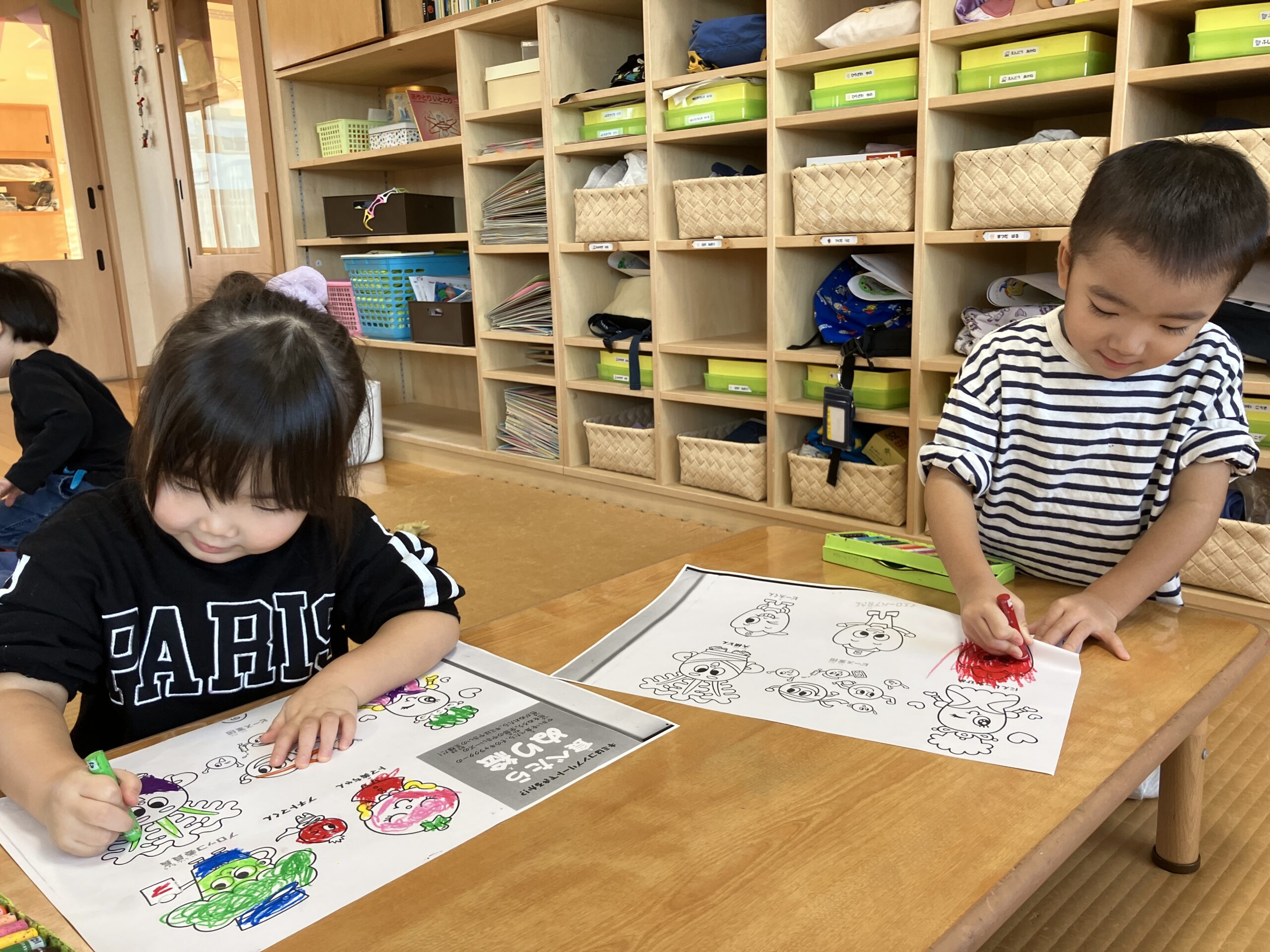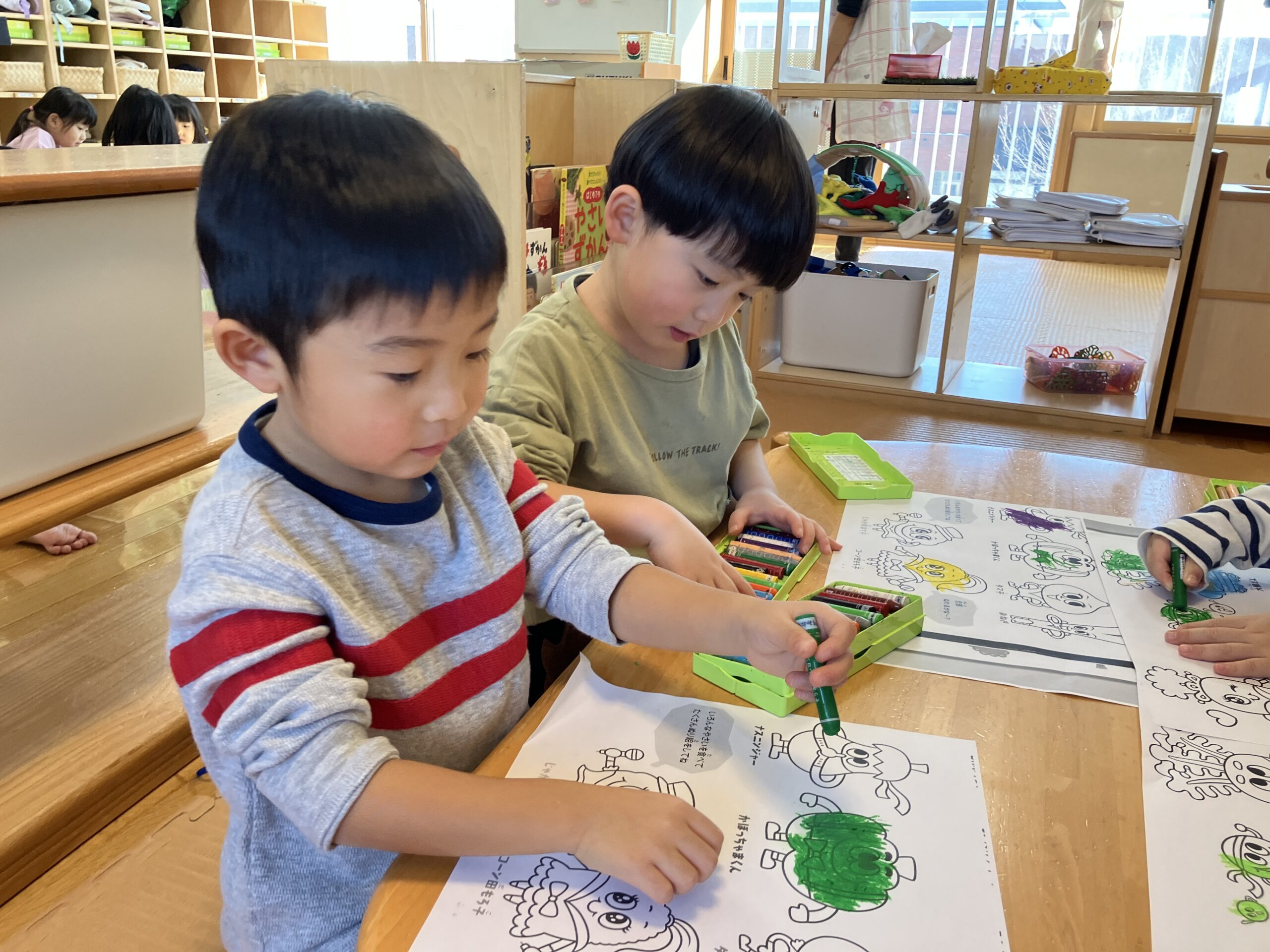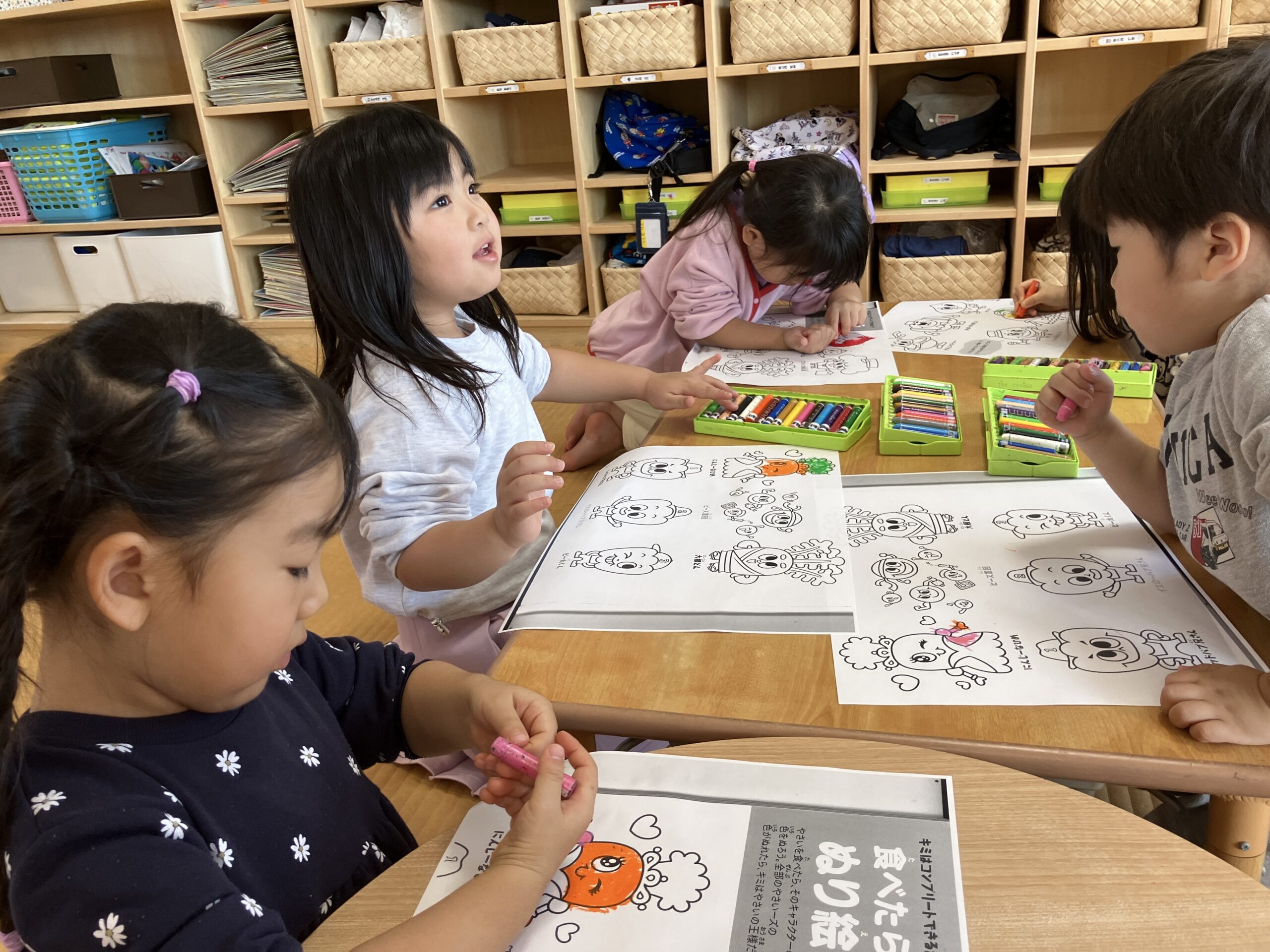 絵本をみんなで覗いてみると、最後に塗り絵があり、「塗ってみる??」と声を掛けると、やさいーズの塗り絵に挑戦!!