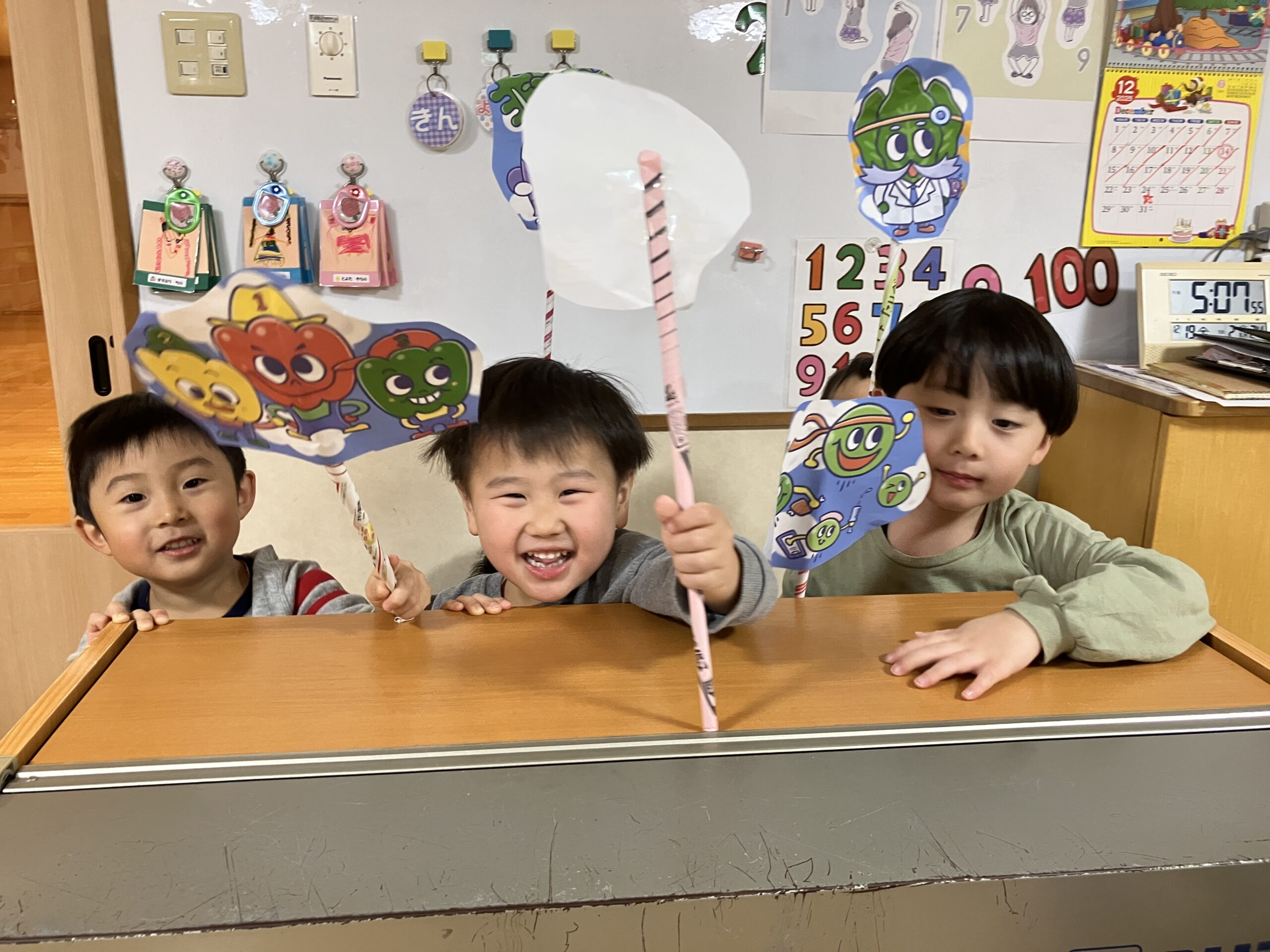 今月のテーマ保育は「野菜の歌を歌ってみよう!」ということで、ぱんだ組の保育室にある「すごいぞ!やさいーズ」の歌をみんなで楽しみました♪