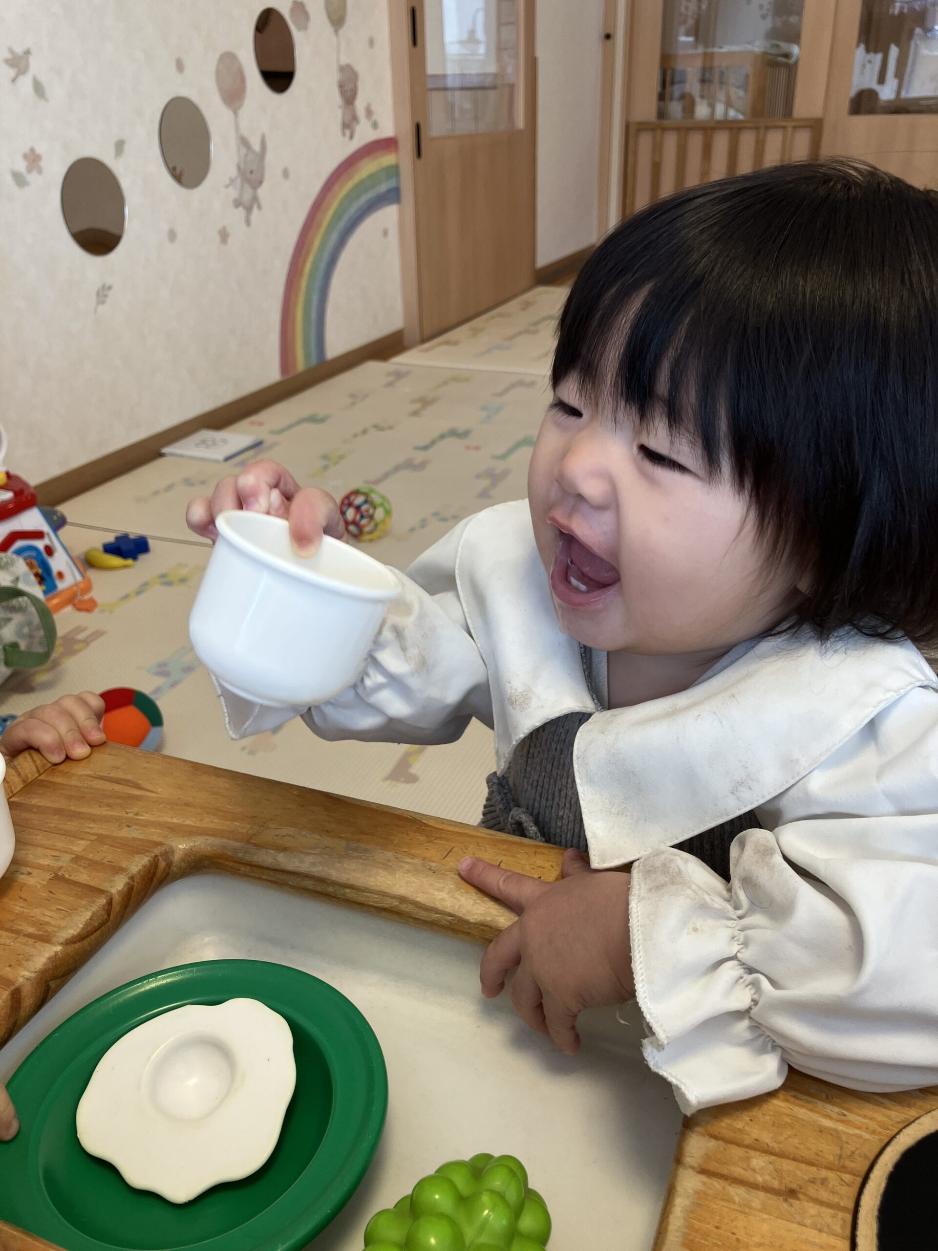 コップで飲む真似をしたり、「いただきます」の仕草をしたり、お皿に食べ物を入れたりと夢中になって遊んでいます✨